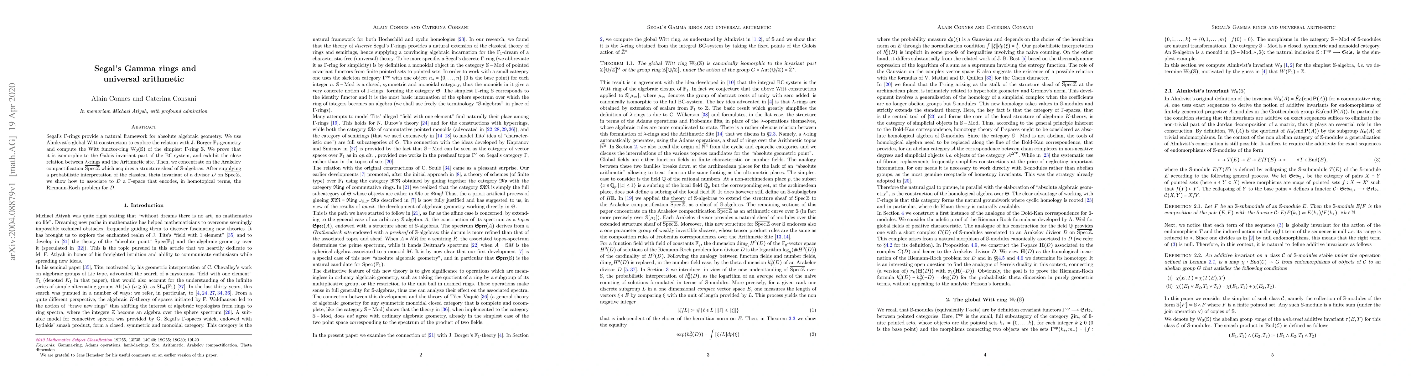 Segal's Gamma-rings provide a natural framework for absolute algebraic geometry. We use Almkvist's global Witt construction to explore the relation with J. Borger F1-geometry and compute the Witt functor-ring of Almkvist for the simplest Gamma-ring S. We prove that it is isomorphic to the Galois invariant part of the BC-system, and exhibit the close relation between Lambda-rings and the Arithmetic site. Then, we concentrate on the Arakelov compactification of Z which acquires a structure sheaf of S-algebras. After supplying a probabilistic interpretation of the classical theta invariant of a divisor D, we show how to associate to D a Gamma-space that encodes, in homotopical terms, the Riemann-Roch problem for D.