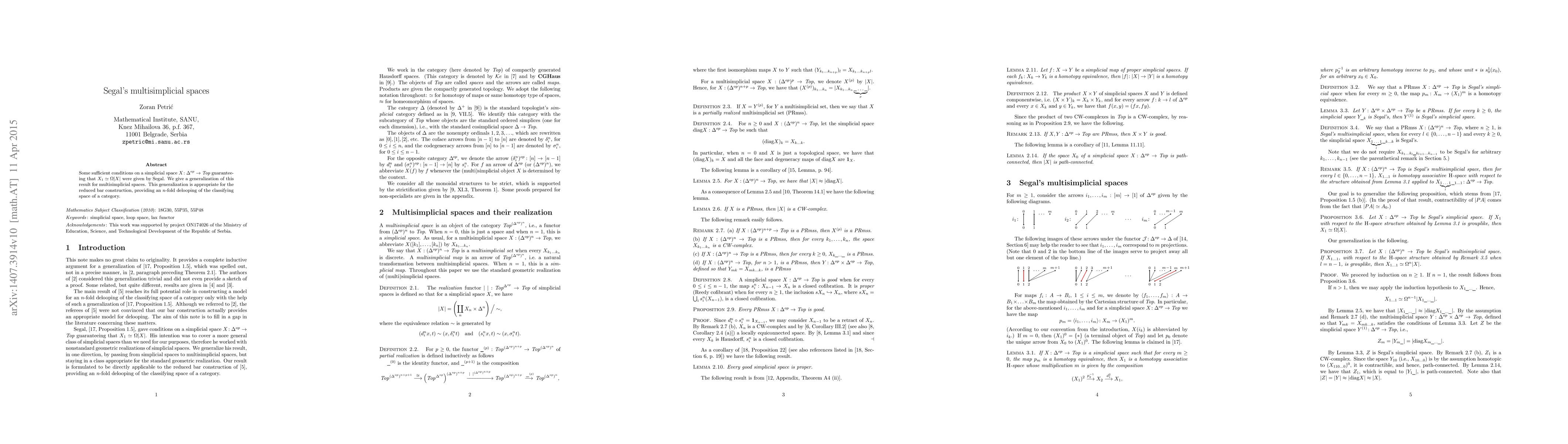 This paper generalizes Segal's conditions for simplicial spaces to multisimplicial spaces, ensuring $X_1 simeq Omega|X|$. The result is applicable to the reduced bar construction, facilitating the n-fold delooping of a category's classifying space.