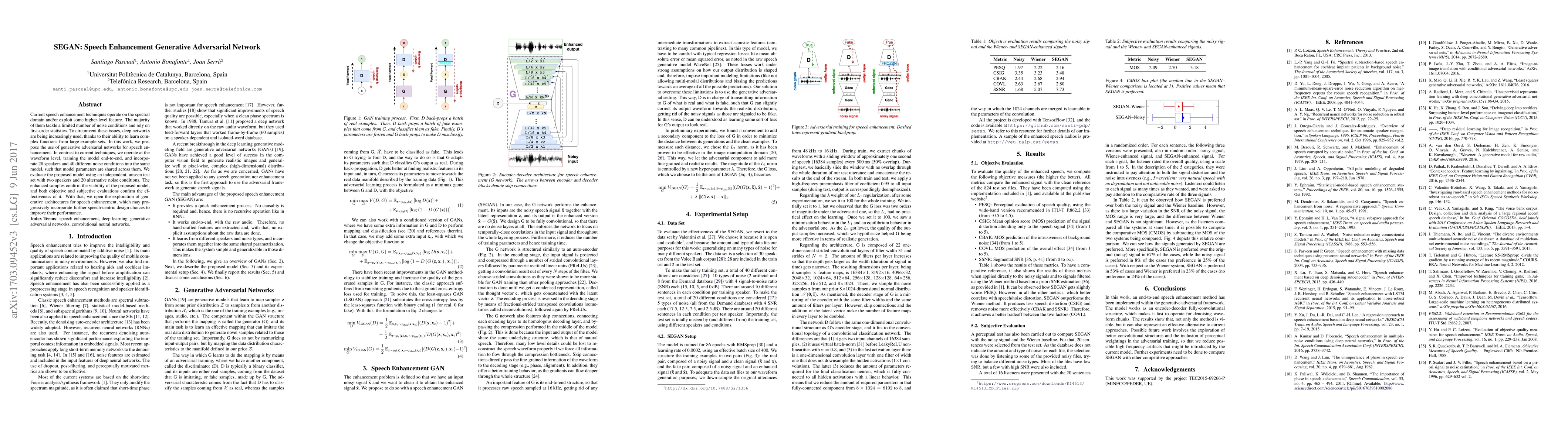 The paper proposes SEGAN, a Speech Enhancement Generative Adversarial Network that operates at the waveform level, enabling end-to-end training and the incorporation of diverse noise conditions and speakers into a single model. Evaluations show the model's effectiveness in enhancing speech under various noise conditions.