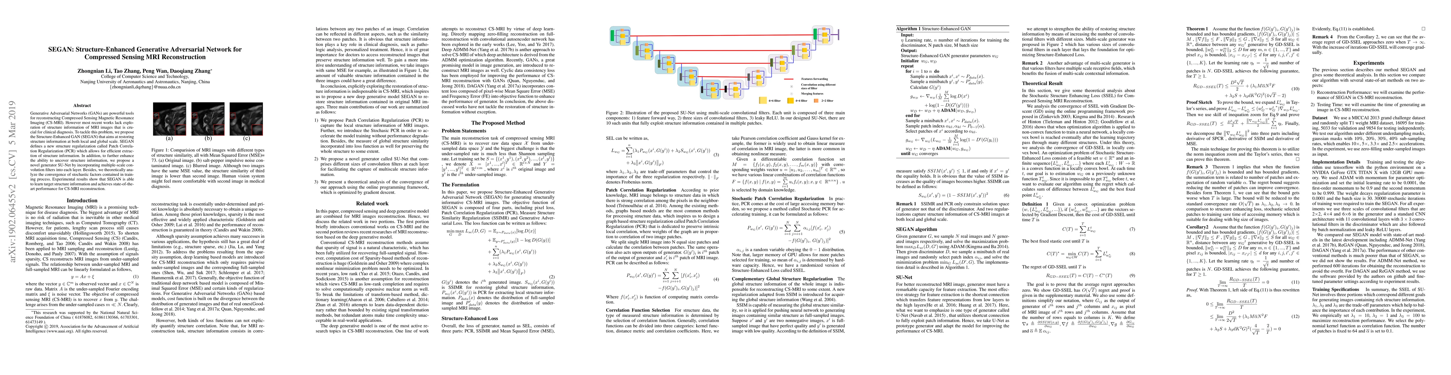 The SEGAN enhances GANs for CS-MRI reconstruction by incorporating structure information through Patch Correlation Regularization and a novel SU-Net generator. This approach demonstrates superior reconstruction performance and better preservation of MRI image structures.
