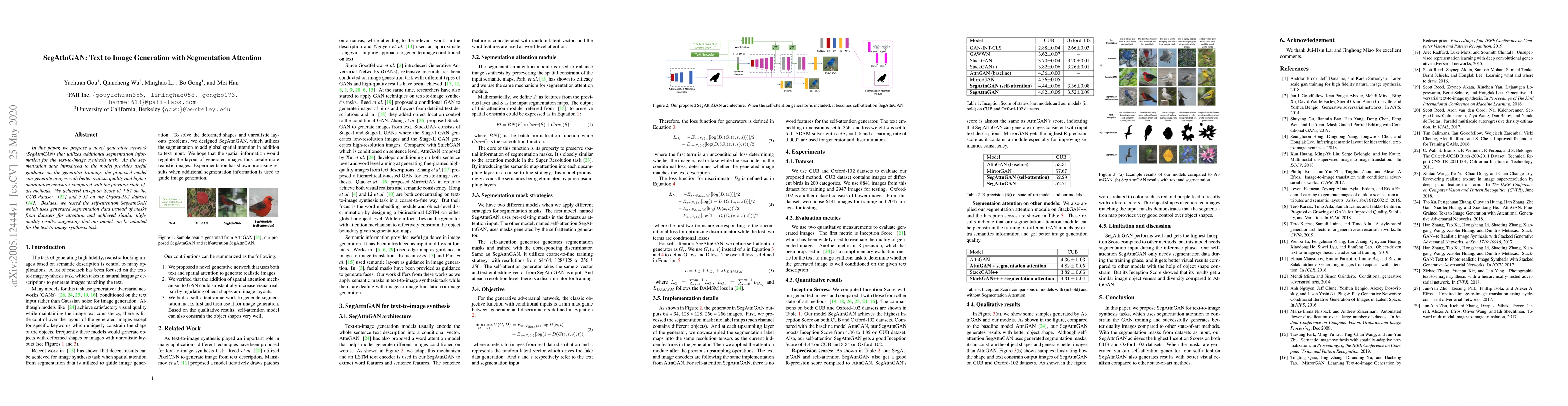 In this paper, we propose a novel generative network (SegAttnGAN) that utilizes additional segmentation information for the text-to-image synthesis task. As the segmentation data introduced to the model provides useful guidance on the generator training, the proposed model can generate images with better realism quality and higher quantitative measures compared with the previous state-of-art methods. We achieved Inception Score of 4.84 on the CUB dataset and 3.52 on the Oxford-102 dataset. Besides, we tested the self-attention SegAttnGAN which uses generated segmentation data instead of masks from datasets for attention and achieved similar high-quality results, suggesting that our model can be adapted for the text-to-image synthesis task.