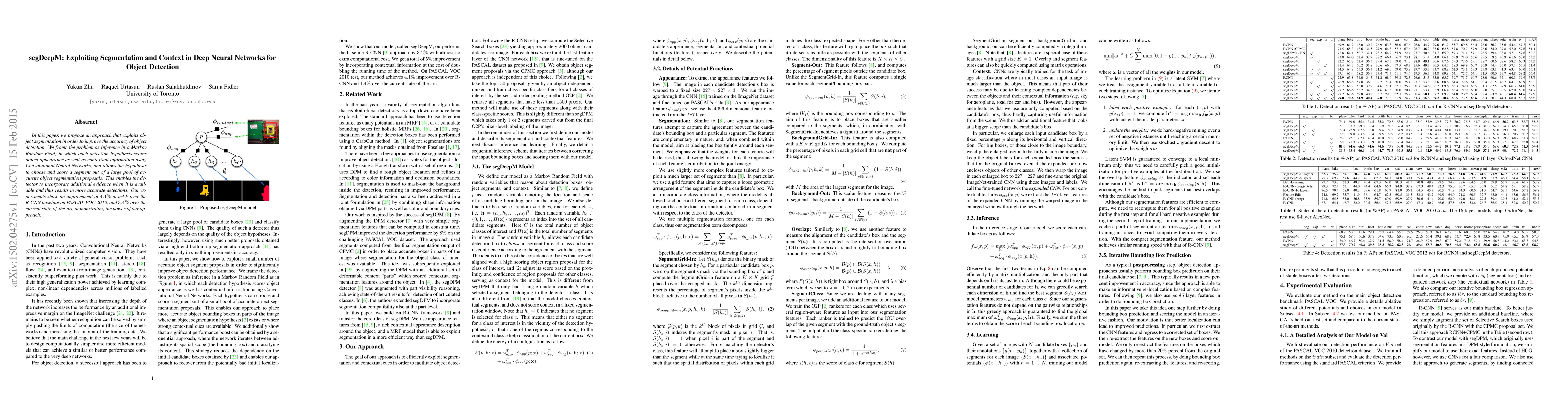 This paper introduces segDeepM, an innovative method that leverages object segmentation to enhance object detection accuracy. By framing the detection task within a Markov Random Field, the approach uses Convolutional Neural Networks to score both appearance and contextual information, allowing for improved detections through the integration of additional evidence. Experimental results show a notable improvement over existing methods, achieving a 4.1% increase in mAP on PASCAL VOC 2010.
