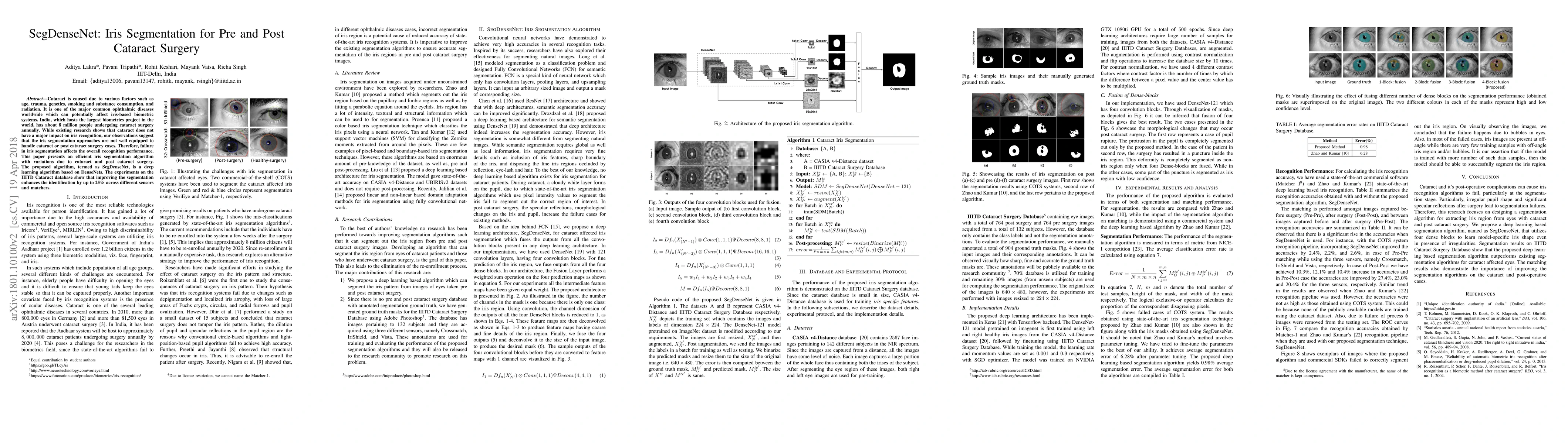 This paper introduces SegDenseNet, a deep learning-based iris segmentation algorithm designed to address challenges in iris recognition due to cataract and post-surgery changes. Experiments on the IIITD Cataract database demonstrate a 25% improvement in identification performance.