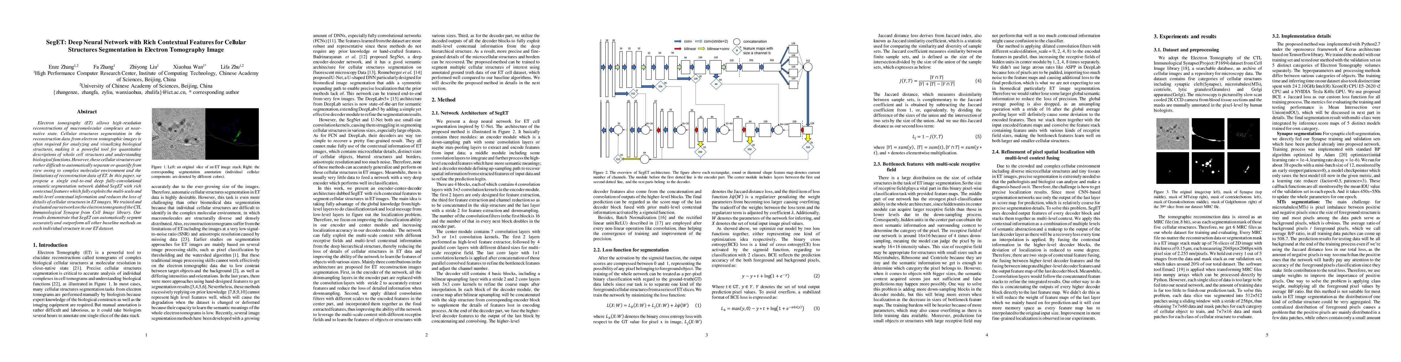Electron tomography (ET) allows high-resolution reconstructions of macromolecular complexes at nearnative state. Cellular structures segmentation in the reconstruction data from electron tomographic images is often required for analyzing and visualizing biological structures, making it a powerful tool for quantitative descriptions of whole cell structures and understanding biological functions. However, these cellular structures are rather difficult to automatically separate or quantify from view owing to complex molecular environment and the limitations of reconstruction data of ET. In this paper, we propose a single end-to-end deep fully-convolutional semantic segmentation network dubbed SegET with rich contextual features which fully exploitsthe multi-scale and multi-level contextual information and reduces the loss of details of cellular structures in ET images. We trained and evaluated our network on the electron tomogram of the CTL Immunological Synapse from Cell Image library. Our results demonstrate that SegET can automatically segment accurately and outperform all other baseline methods on each individual structure in our ET dataset.