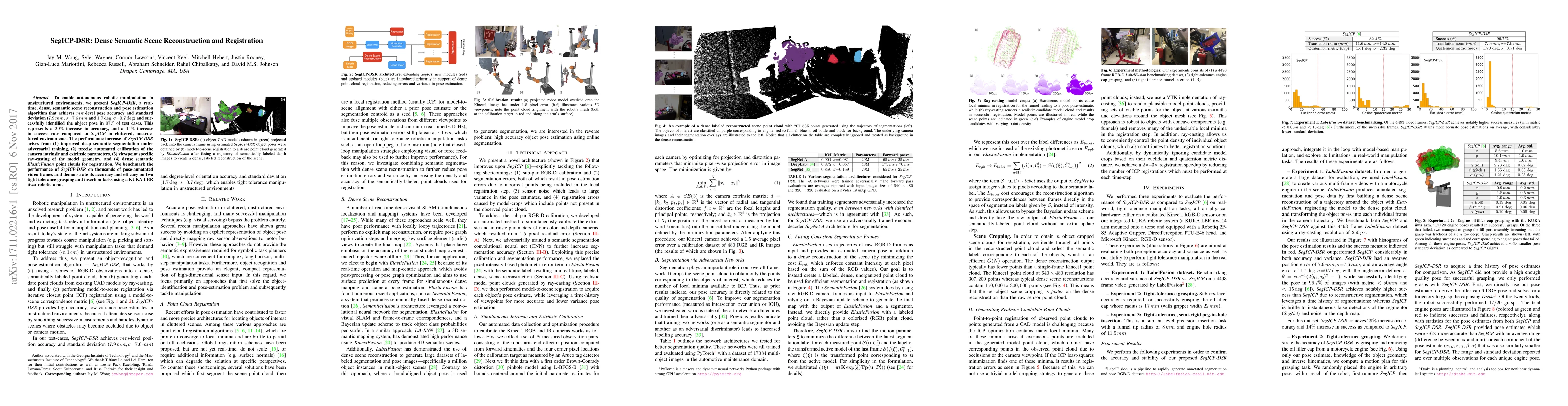 To enable autonomous robotic manipulation in unstructured environments, we present SegICP-DSR, a real- time, dense, semantic scene reconstruction and pose estimation algorithm that achieves mm-level pose accuracy and standard deviation (7.9 mm, {\sigma}=7.6 mm and 1.7 deg, {\sigma}=0.7 deg) and suc- cessfully identified the object pose in 97% of test cases. This represents a 29% increase in accuracy, and a 14% increase in success rate compared to SegICP in cluttered, unstruc- tured environments. The performance increase of SegICP-DSR arises from (1) improved deep semantic segmentation under adversarial training, (2) precise automated calibration of the camera intrinsic and extrinsic parameters, (3) viewpoint specific ray-casting of the model geometry, and (4) dense semantic ElasticFusion point clouds for registration. We benchmark the performance of SegICP-DSR on thousands of pose-annotated video frames and demonstrate its accuracy and efficacy on two tight tolerance grasping and insertion tasks using a KUKA LBR iiwa robotic arm.