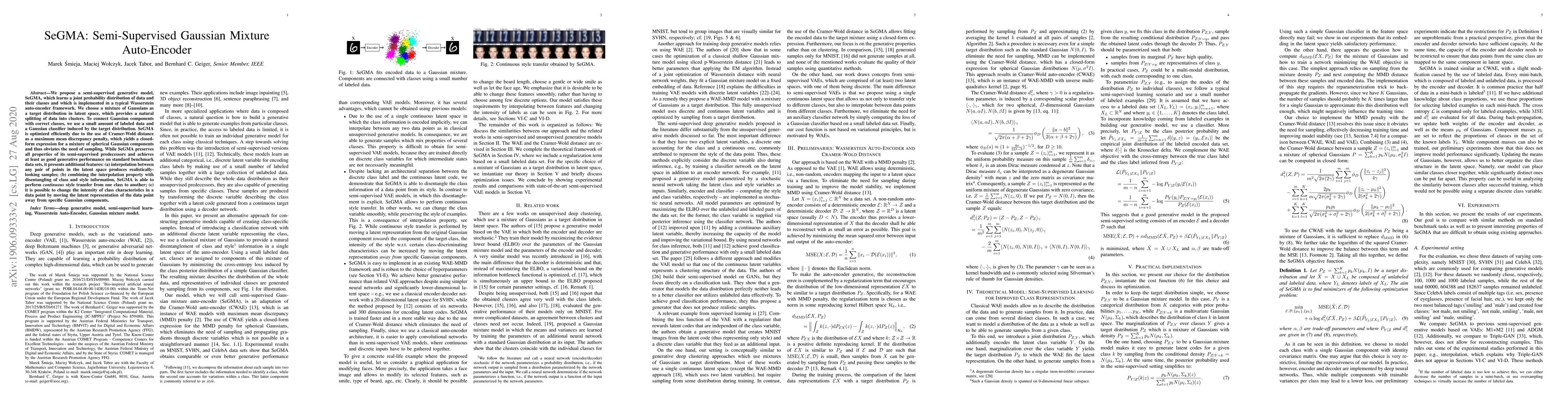 SeGMA is a semi-supervised generative model using a Wasserstein auto-encoder with Gaussian mixtures for latent space clustering. It efficiently optimizes using a Cramer-Wold distance penalty, enabling realistic interpolation and continuous style transfer between classes.