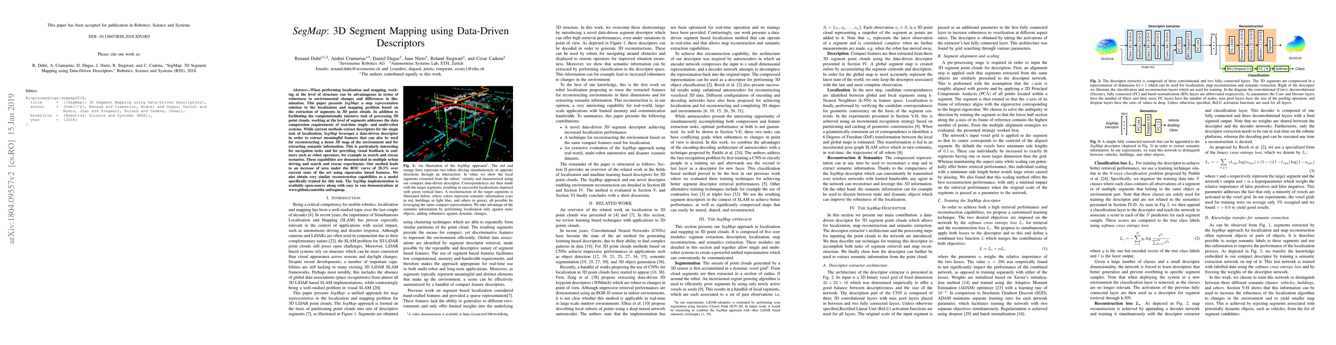 When performing localization and mapping, working at the level of structure can be advantageous in terms of robustness to environmental changes and differences in illumination. This paper presents SegMap: a map representation solution to the localization and mapping problem based on the extraction of segments in 3D point clouds. In addition to facilitating the computationally intensive task of processing 3D point clouds, working at the level of segments addresses the data compression requirements of real-time single- and multi-robot systems. While current methods extract descriptors for the single task of localization, SegMap leverages a data-driven descriptor in order to extract meaningful features that can also be used for reconstructing a dense 3D map of the environment and for extracting semantic information. This is particularly interesting for navigation tasks and for providing visual feedback to end-users such as robot operators, for example in search and rescue scenarios. These capabilities are demonstrated in multiple urban driving and search and rescue experiments. Our method leads to an increase of area under the ROC curve of 28.3% over current state of the art using eigenvalue based features. We also obtain very similar reconstruction capabilities to a model specifically trained for this task. The SegMap implementation will be made available open-source along with easy to run demonstrations at www.github.com/ethz-asl/segmap. A video demonstration is available at https://youtu.be/CMk4w4eRobg.