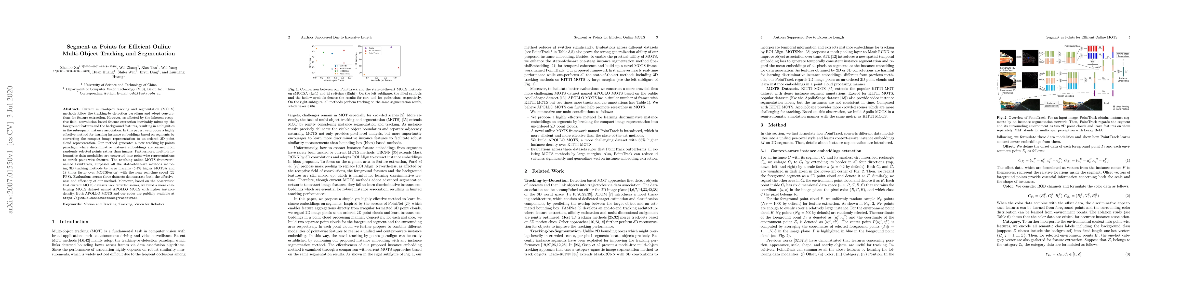 Current multi-object tracking and segmentation (MOTS) methods follow the tracking-by-detection paradigm and adopt convolutions for feature extraction. However, as affected by the inherent receptive field, convolution based feature extraction inevitably mixes up the foreground features and the background features, resulting in ambiguities in the subsequent instance association. In this paper, we propose a highly effective method for learning instance embeddings based on segments by converting the compact image representation to un-ordered 2D point cloud representation. Our method generates a new tracking-by-points paradigm where discriminative instance embeddings are learned from randomly selected points rather than images. Furthermore, multiple informative data modalities are converted into point-wise representations to enrich point-wise features. The resulting online MOTS framework, named PointTrack, surpasses all the state-of-the-art methods including 3D tracking methods by large margins (5.4% higher MOTSA and 18 times faster over MOTSFusion) with the near real-time speed (22 FPS). Evaluations across three datasets demonstrate both the effectiveness and efficiency of our method. Moreover, based on the observation that current MOTS datasets lack crowded scenes, we build a more challenging MOTS dataset named APOLLO MOTS with higher instance density. Both APOLLO MOTS and our codes are publicly available at https://github.com/detectRecog/PointTrack.