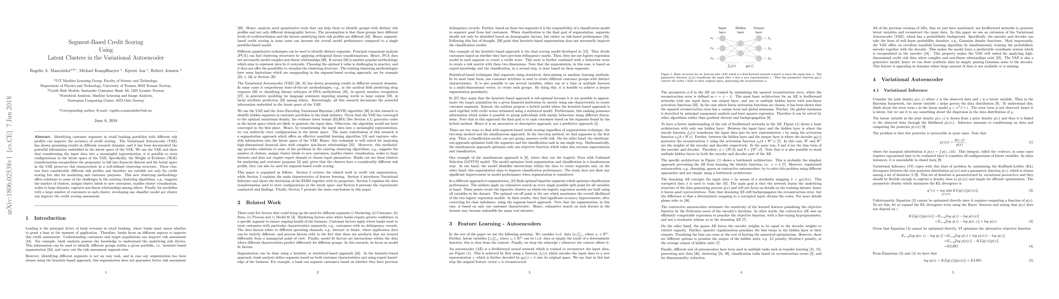 This paper proposes a novel credit scoring method using a Variational Autoencoder (VAE) to identify customer segments with distinct risk profiles, improving accuracy. The VAE's latent space captures the propensity for financial distress through Weight of Evidence transformation, enabling effective cluster visualization and scalability, while developing individual classifiers for clusters enhances scoring.