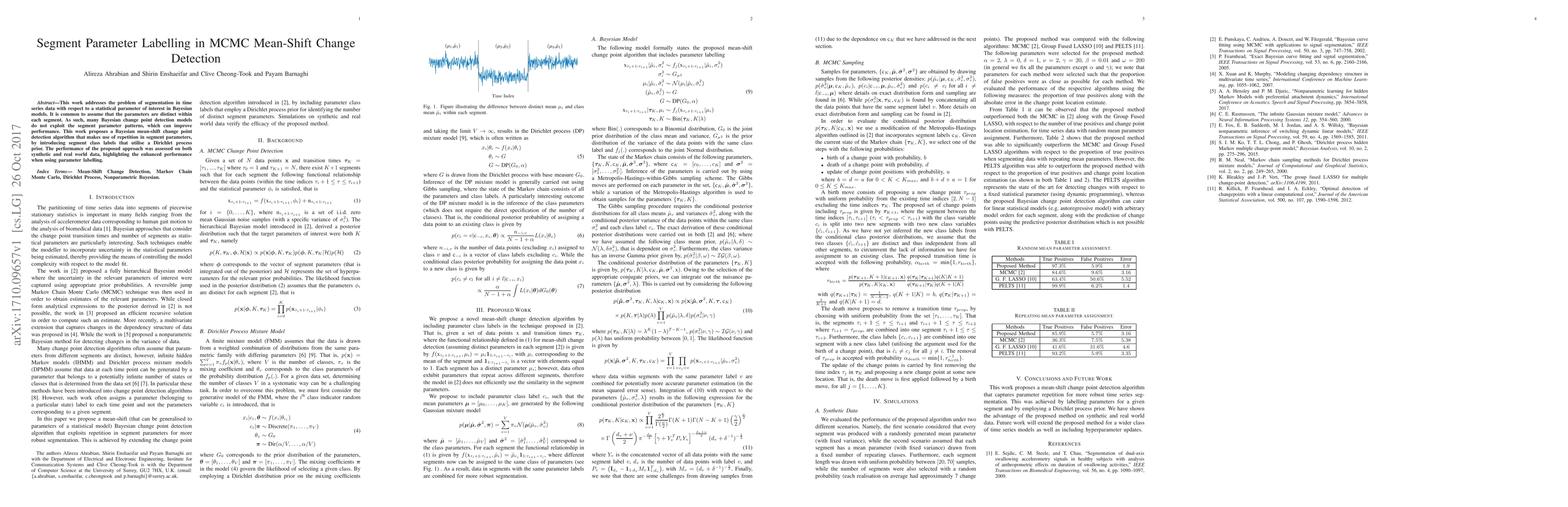 This paper proposes a Bayesian mean-shift change point detection algorithm that leverages segment parameter repetition through class labels, utilizing a Dirichlet process prior. The method demonstrates improved performance over traditional models on both synthetic and real-world time series data.