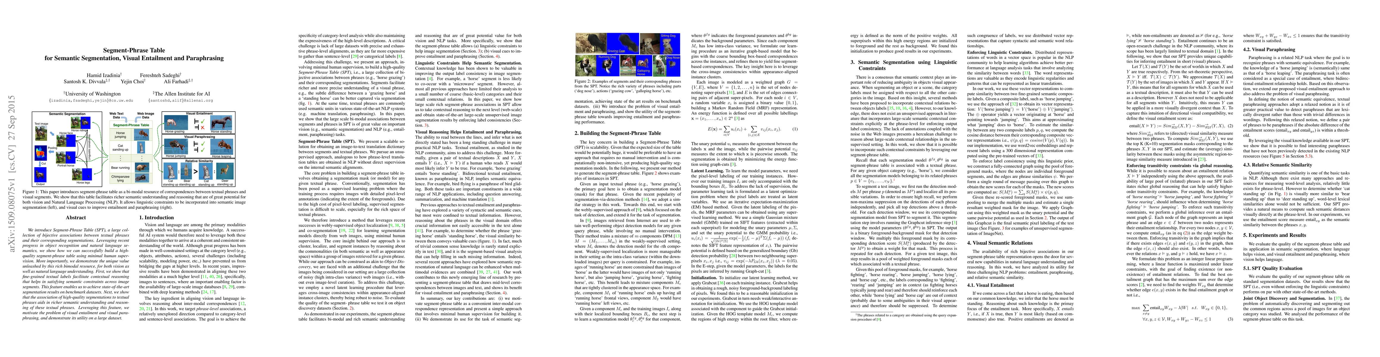 The paper introduces the Segment-Phrase Table (SPT), a resource linking textual phrases to image segmentations, built with minimal human supervision. It demonstrates SPT's benefits for both semantic segmentation and natural language understanding, achieving state-of-the-art segmentation results and enabling visual entailment and paraphrasing.