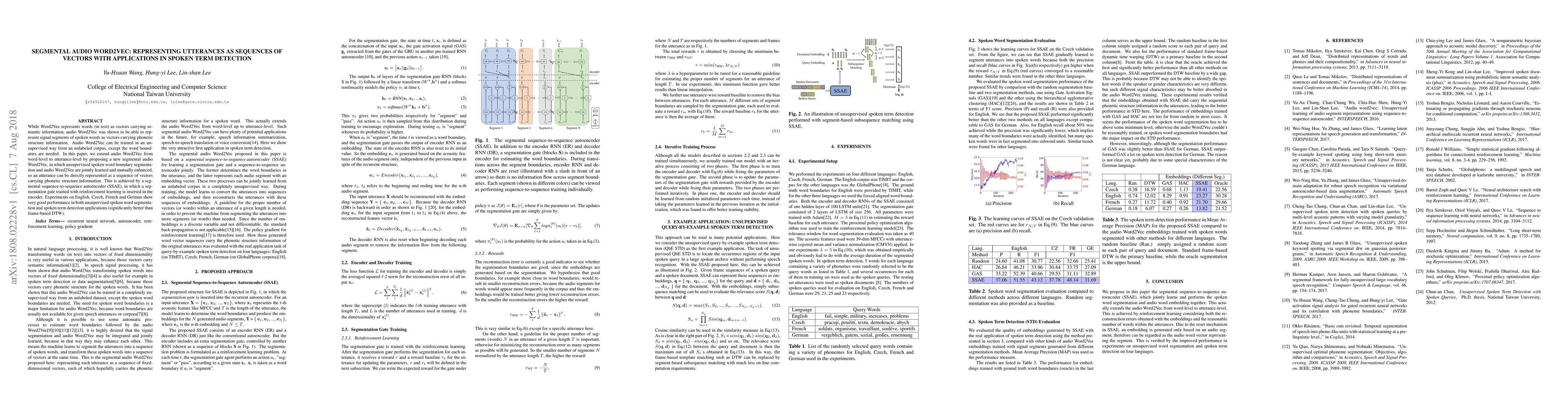 This paper proposes a segmental audio Word2Vec model that represents entire utterances as sequences of vectors, enabling unsupervised spoken word boundary segmentation and improving spoken term detection. The model uses a segmental sequence-to-sequence autoencoder with a reinforcement learning-based segmentation gate, achieving superior performance over traditional methods.
