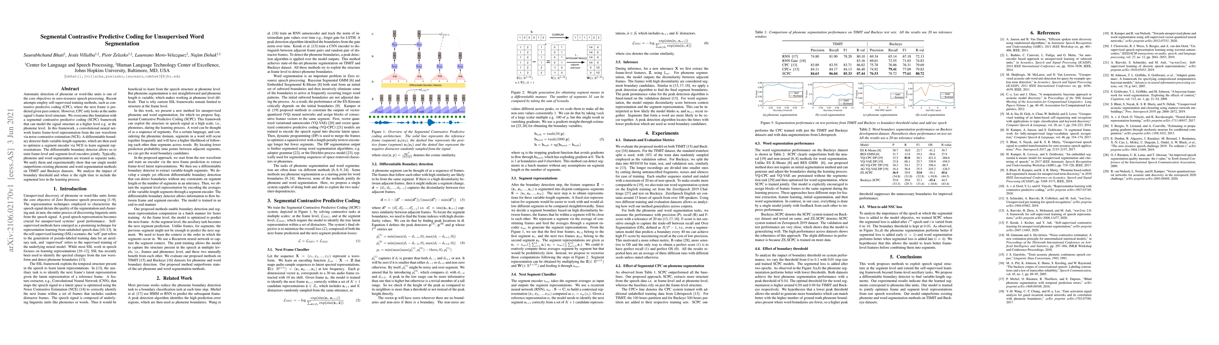 This paper proposes a segmental contrastive predictive coding (SCPC) framework for unsupervised word segmentation, combining frame-level and segment-level encoding to outperform existing phoneme and word segmentation methods on TIMIT and Buckeye datasets. The model jointly trains frame-level and segment-level encoders using a differentiable boundary detector, achieving better performance through unified segmentation.