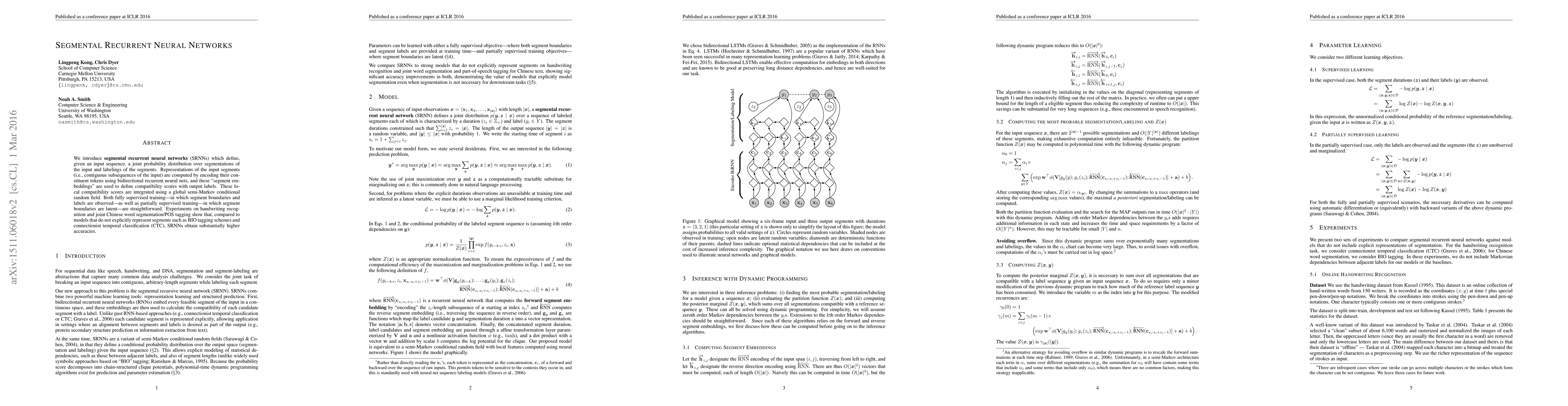 Segmental Recurrent Neural Networks (SRNNs) model input sequences by segmenting them and encoding segments with bidirectional RNNs, integrating compatibility scores via a global semi-Markov CRF for label prediction, achieving higher accuracy in handwriting recognition and Chinese word segmentation/POS tagging compared to non-segment-based models.