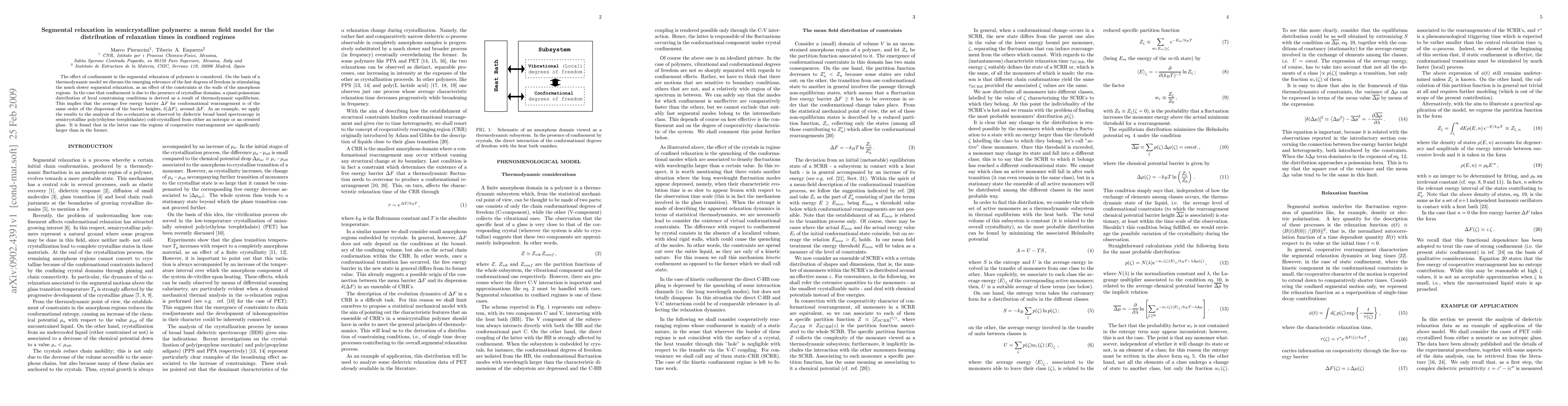 This paper proposes a mean field model to analyze segmental relaxation in semicrystalline polymers under confinement, highlighting the role of fast degrees of freedom in accelerating slower relaxation processes. The model reveals that the average free energy barrier for conformational rearrangement is comparable to the dispersion of barrier heights, with implications for understanding $\alpha$-relaxation in semicrystalline poly(ethylene terephthalate).