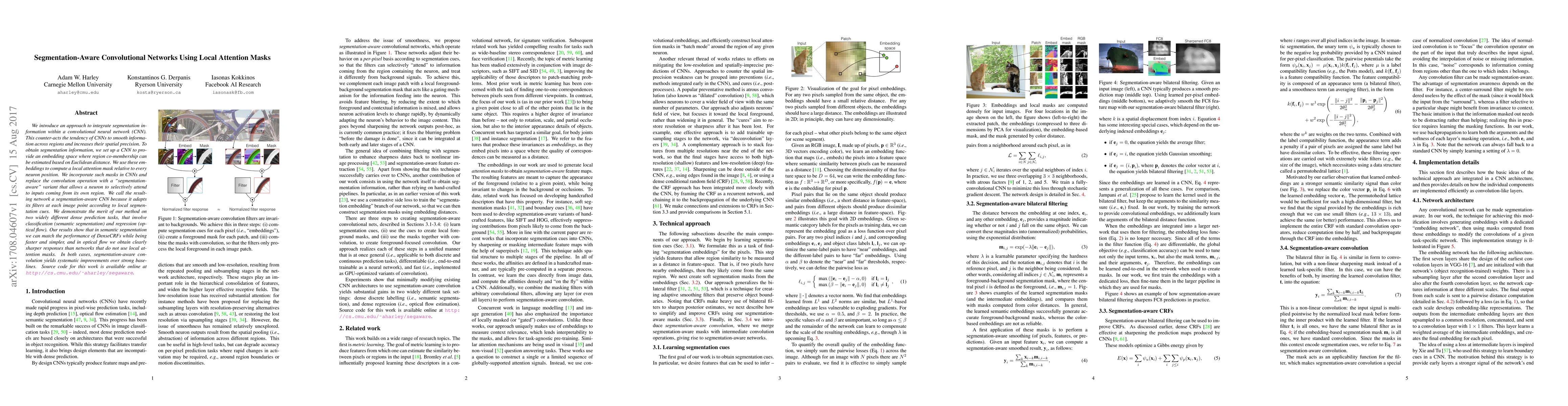 We introduce an approach to integrate segmentation information within a convolutional neural network (CNN). This counter-acts the tendency of CNNs to smooth information across regions and increases their spatial precision. To obtain segmentation information, we set up a CNN to provide an embedding space where region co-membership can be estimated based on Euclidean distance. We use these embeddings to compute a local attention mask relative to every neuron position. We incorporate such masks in CNNs and replace the convolution operation with a "segmentation-aware" variant that allows a neuron to selectively attend to inputs coming from its own region. We call the resulting network a segmentation-aware CNN because it adapts its filters at each image point according to local segmentation cues. We demonstrate the merit of our method on two widely different dense prediction tasks, that involve classification (semantic segmentation) and regression (optical flow). Our results show that in semantic segmentation we can match the performance of DenseCRFs while being faster and simpler, and in optical flow we obtain clearly sharper responses than networks that do not use local attention masks. In both cases, segmentation-aware convolution yields systematic improvements over strong baselines. Source code for this work is available online at http://cs.cmu.edu/~aharley/segaware.