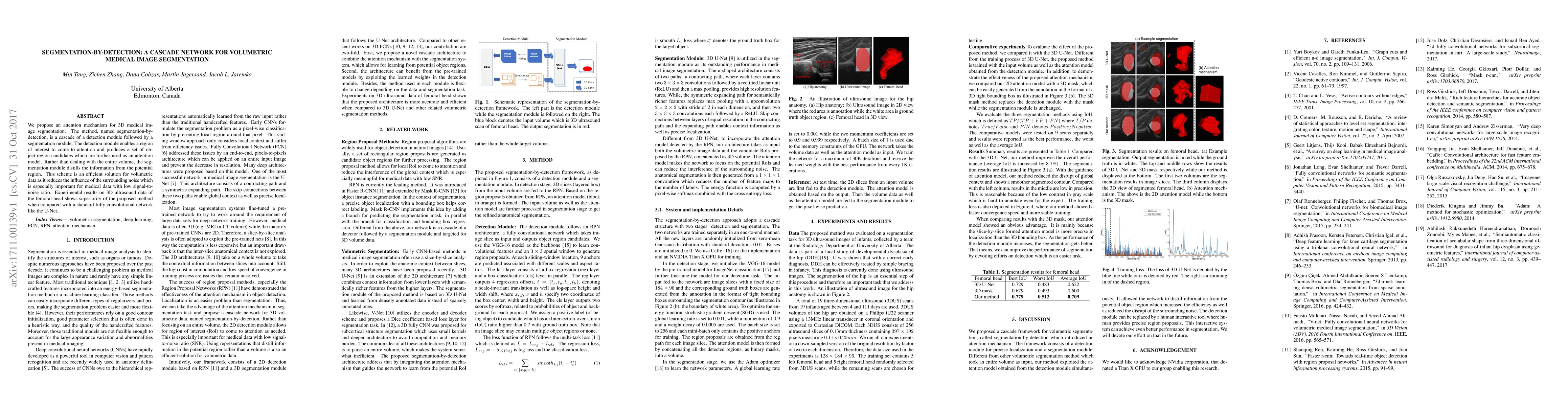 The paper introduces a cascade network called segmentation-by-detection for 3D medical image segmentation, which uses a detection module to focus on regions of interest before segmenting them, improving efficiency and reducing noise influence. This method outperforms standard U-Net networks in segmenting 3D ultrasound data of the femoral head.