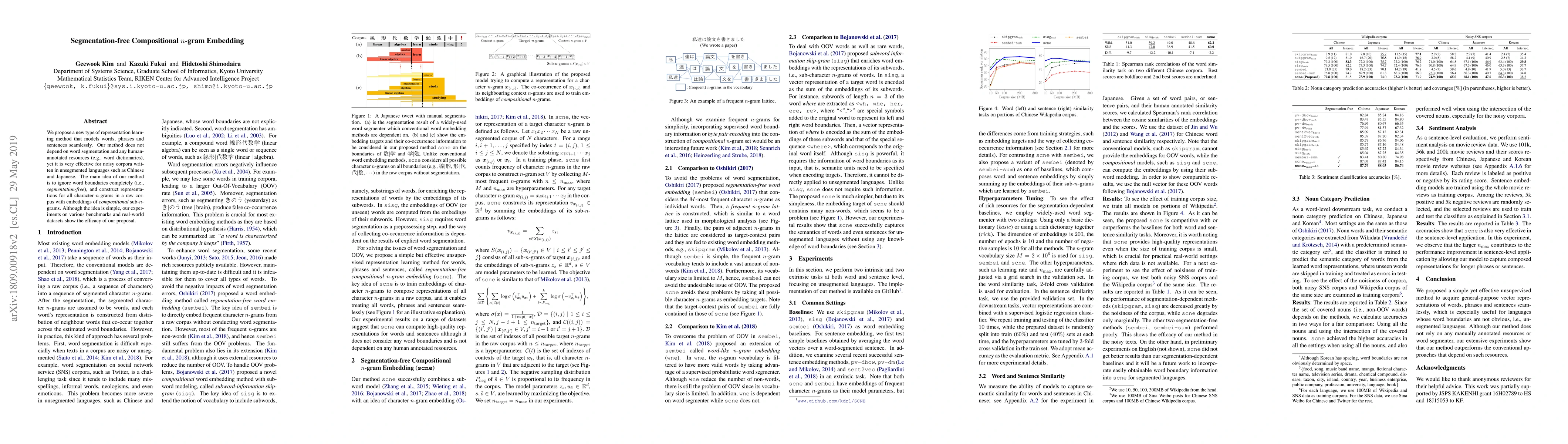 We propose a new type of representation learning method that models words, phrases and sentences seamlessly. Our method does not depend on word segmentation and any human-annotated resources (e.g., word dictionaries), yet it is very effective for noisy corpora written in unsegmented languages such as Chinese and Japanese. The main idea of our method is to ignore word boundaries completely (i.e., segmentation-free), and construct representations for all character $n$-grams in a raw corpus with embeddings of compositional sub-$n$-grams. Although the idea is simple, our experiments on various benchmarks and real-world datasets show the efficacy of our proposal.
