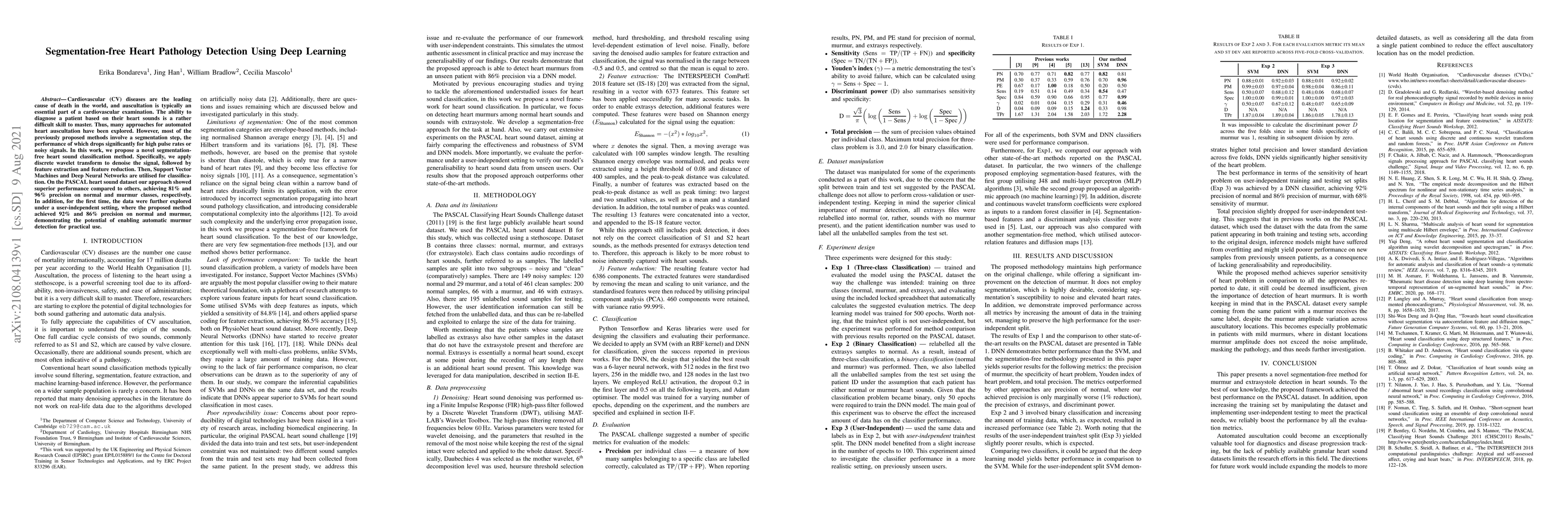 This paper proposes a segmentation-free deep learning method for detecting heart pathologies from auscultation sounds using discrete wavelet transform for denoising, followed by feature extraction and classification with Support Vector Machines and Deep Neural Networks. The method achieved superior performance on the PASCAL heart sound dataset, demonstrating potential for practical automatic murmur detection.
