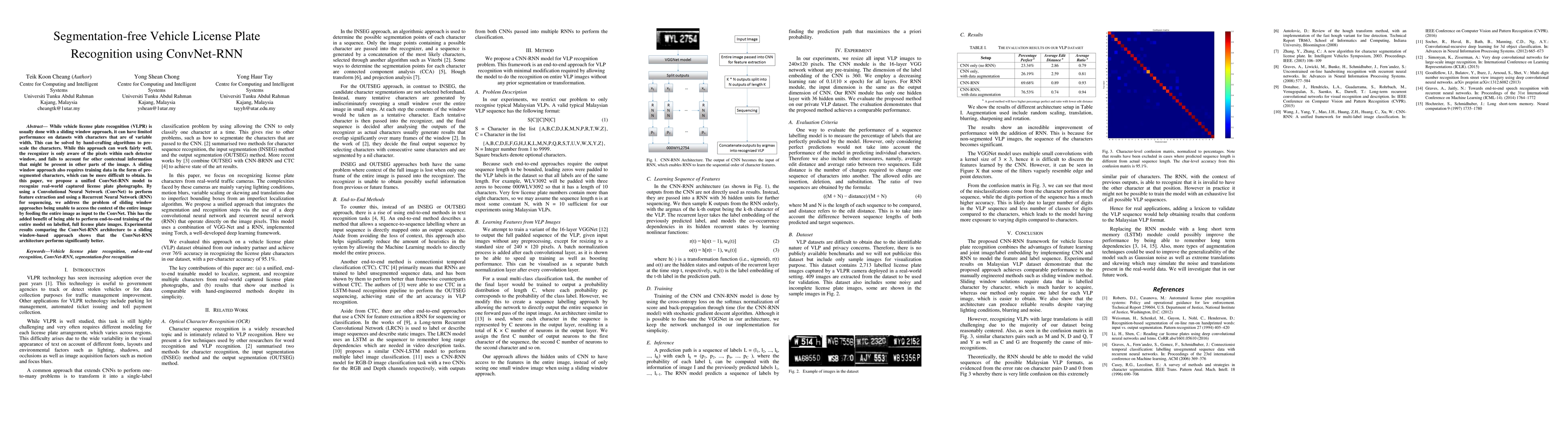 This paper proposes a ConvNet-RNN model for segmentation-free vehicle license plate recognition, addressing the limitations of sliding window approaches by using the entire image for context and enabling end-to-end training without presegmented characters. Experimental results show superior performance compared to traditional methods.