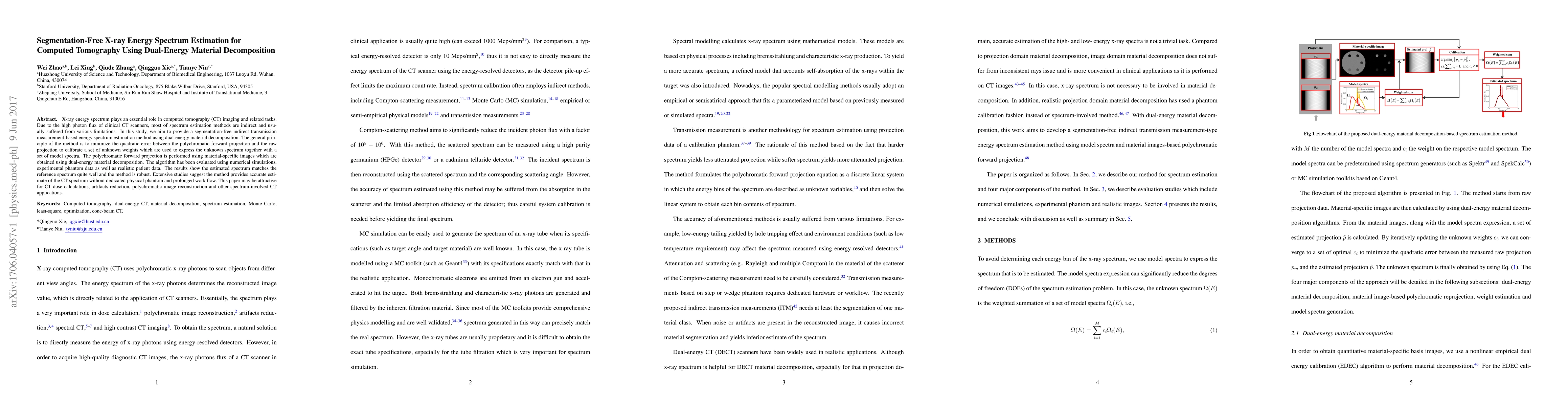 The research methodology used a transmission measurement-based energy spectrum estimation method using dual-energy material decomposition to minimize the quadratic error between polychromatic forward projection and raw projection.