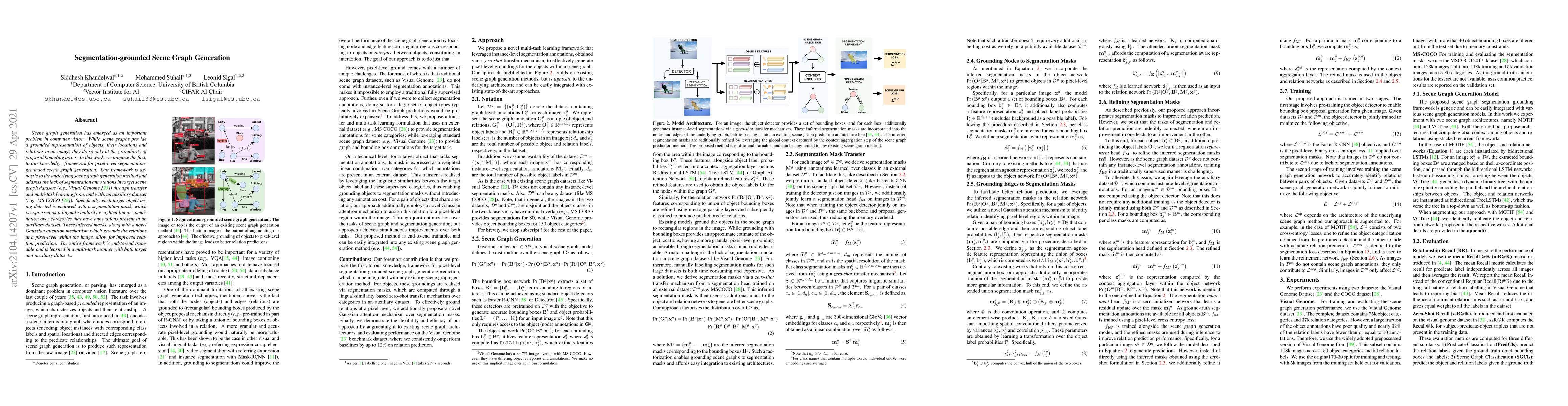 This paper introduces a novel framework for generating pixel-level segmentation-grounded scene graphs by leveraging transfer and multi-task learning from auxiliary datasets. The approach improves relation prediction through inferred segmentation masks and a Gaussian attention mechanism.