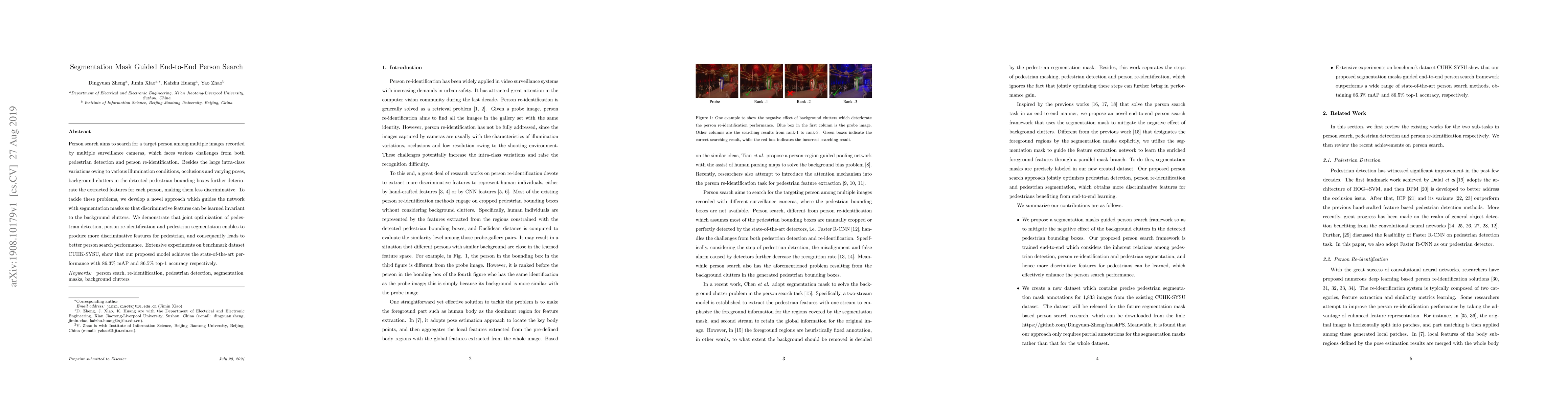 Person search aims to search for a target person among multiple images recorded by multiple surveillance cameras, which faces various challenges from both pedestrian detection and person re-identification. Besides the large intra-class variations owing to various illumination conditions, occlusions and varying poses, background clutters in the detected pedestrian bounding boxes further deteriorate the extracted features for each person, making them less discriminative. To tackle these problems, we develop a novel approach which guides the network with segmentation masks so that discriminative features can be learned invariant to the background clutters. We demonstrate that joint optimization of pedestrian detection, person re-identification and pedestrian segmentation enables to produce more discriminative features for pedestrian, and consequently leads to better person search performance. Extensive experiments on benchmark dataset CUHK-SYSU, show that our proposed model achieves the state-of-the-art performance with 86.3% mAP and 86.5 top-1 accuracy respectively.