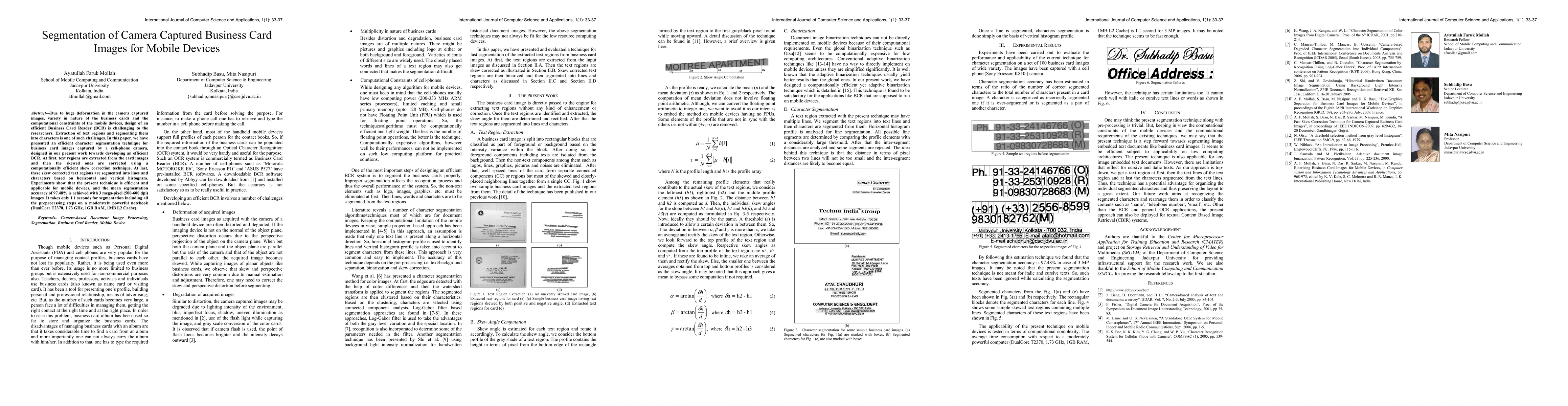 This paper presents an efficient character segmentation technique for mobile-captured business card images, addressing challenges like deformation and computational constraints. The method extracts text regions, corrects skew, and segments them using histograms, achieving a mean accuracy of 97.48% and processing time of 1.1 seconds on a standard notebook.