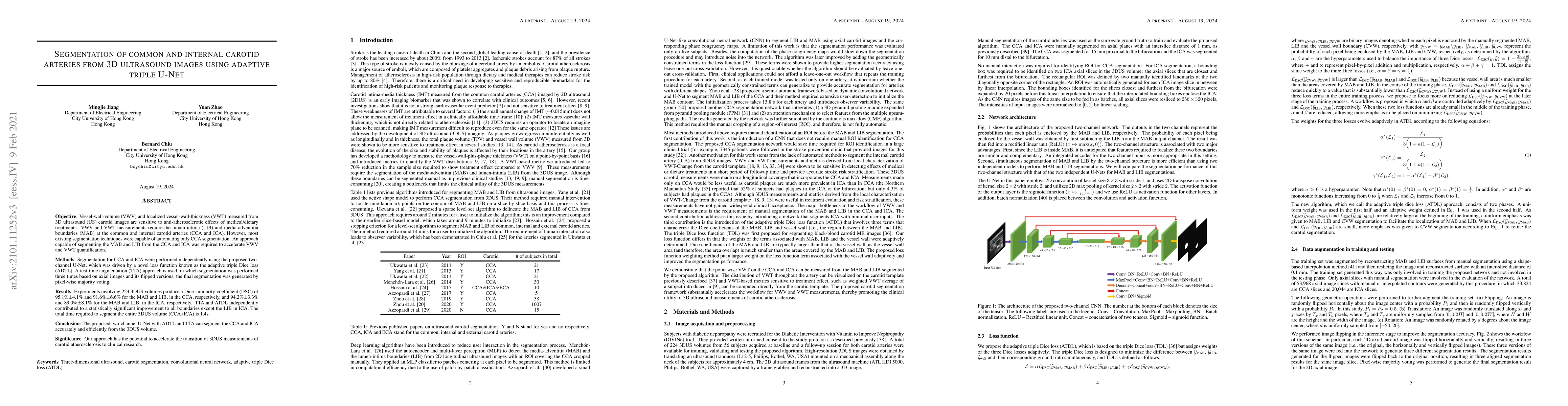 The paper proposes an adaptive triple U-Net with a novel loss function and test-time augmentation to accurately segment the common and internal carotid arteries from 3D ultrasound images, achieving high Dice similarity coefficients for both lumen-intima and media-adventitia boundaries. This method can efficiently facilitate clinical research on carotid atherosclerosis.