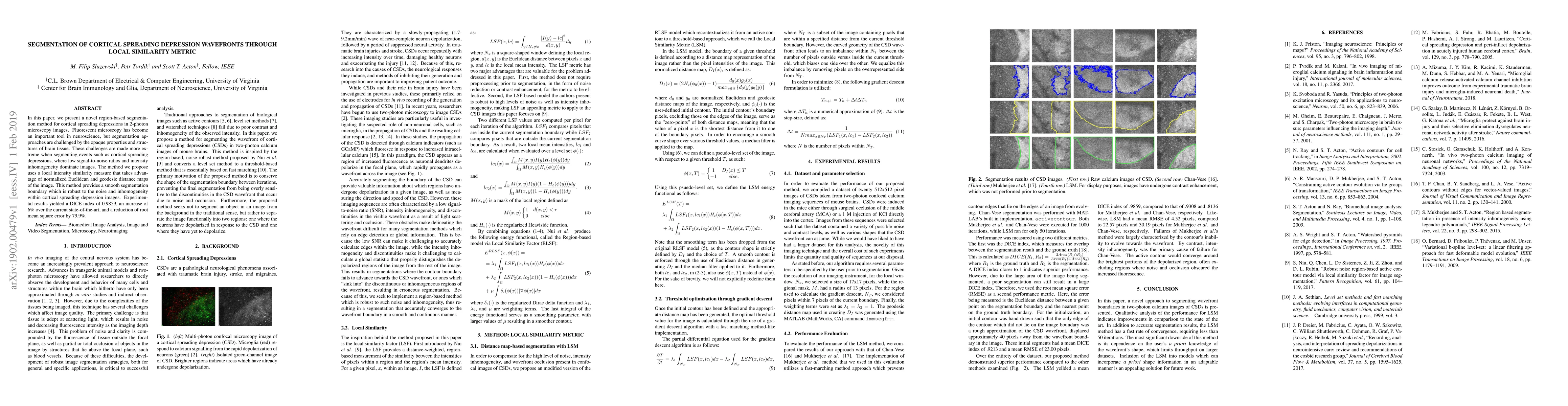 This paper introduces a new segmentation method for cortical spreading depressions using local intensity similarity metrics in 2-photon microscopy images, achieving a DICE index of 0.9859 and a 79.9% reduction in root mean square error, outperforming current state-of-the-art techniques.