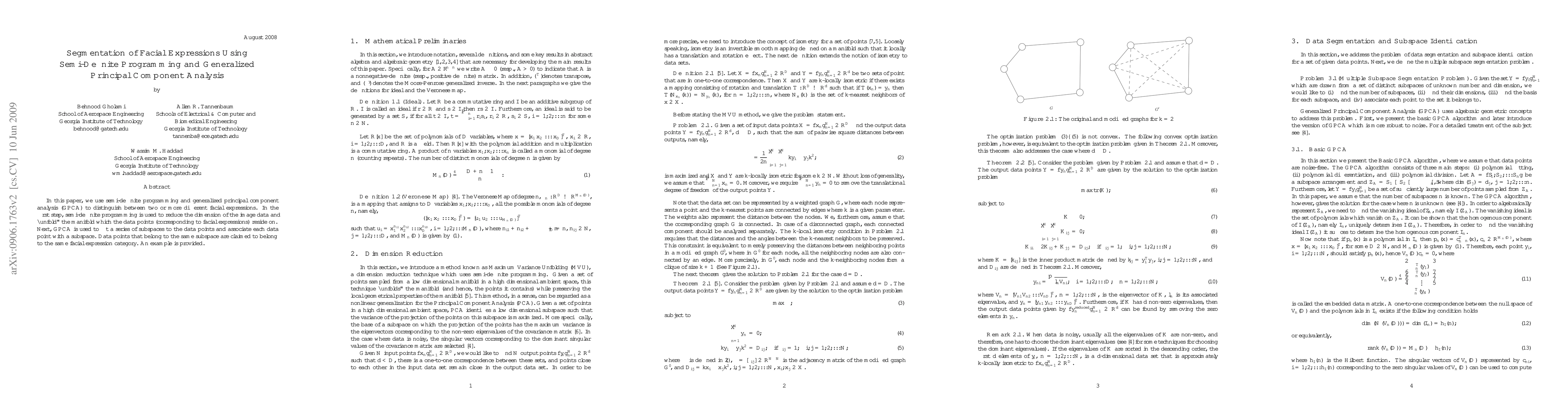 In this paper, we use semi-definite programming and generalized principal component analysis (GPCA) to distinguish between two or more different facial expressions. In the first step, semi-definite programming is used to reduce the dimension of the image data and "unfold" the manifold which the data points (corresponding to facial expressions) reside on. Next, GPCA is used to fit a series of subspaces to the data points and associate each data point with a subspace. Data points that belong to the same subspace are claimed to belong to the same facial expression category. An example is provided.