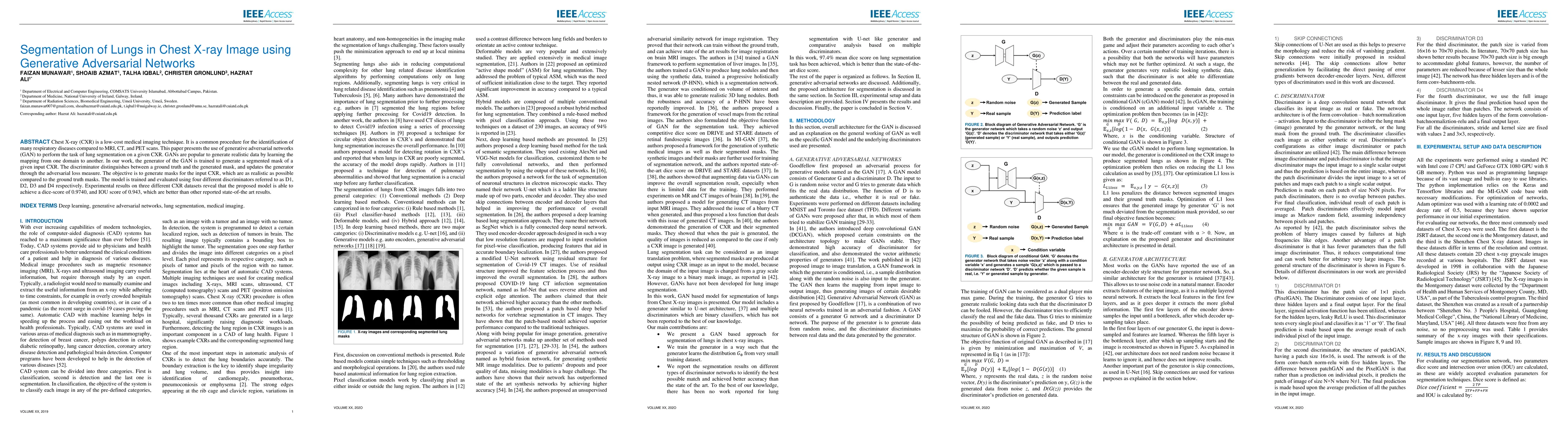 This paper utilizes generative adversarial networks (GANs) to segment lungs in chest X-ray images, achieving a dice-score of 0.9740 and IOU score of 0.943, outperforming other state-of-the-art methods. The GAN model comprises a generator that creates lung masks and a discriminator that evaluates them against ground truth masks.