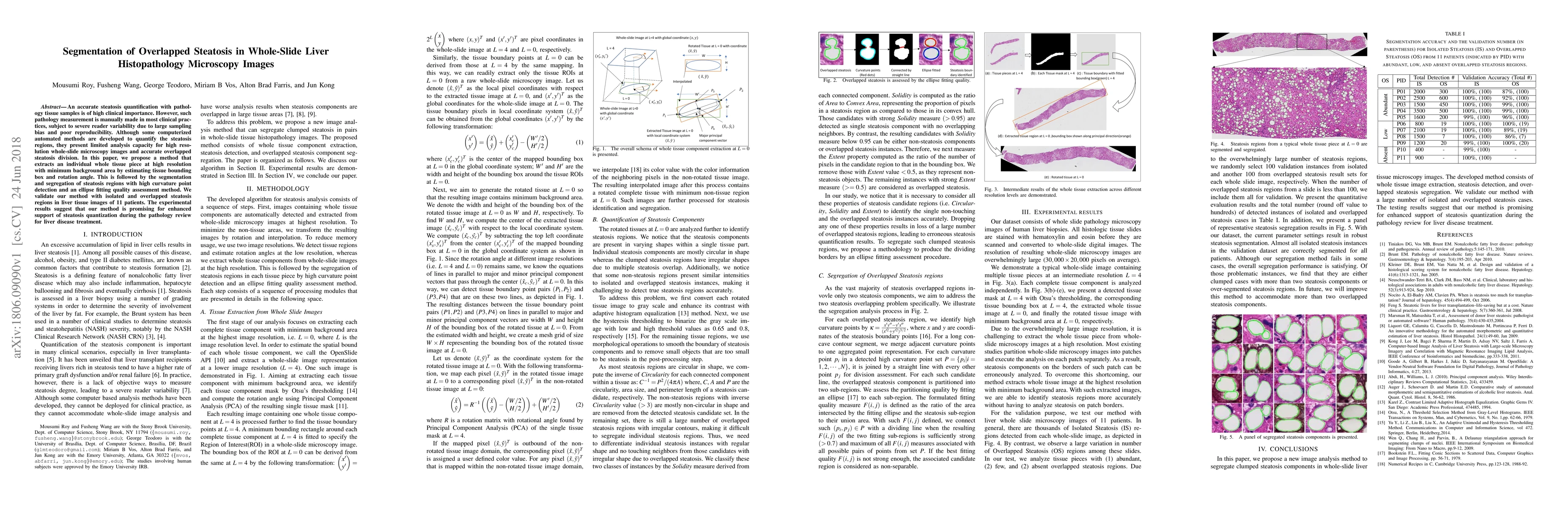 An accurate steatosis quantification with pathology tissue samples is of high clinical importance. However, such pathology measurement is manually made in most clinical practices, subject to severe reader variability due to large sampling bias and poor reproducibility. Although some computerized automated methods are developed to quantify the steatosis regions, they present limited analysis capacity for high resolution whole-slide microscopy images and accurate overlapped steatosis division. In this paper, we propose a method that extracts an individual whole tissue piece at high resolution with minimum background area by estimating tissue bounding box and rotation angle. This is followed by the segmentation and segregation of steatosis regions with high curvature point detection and an ellipse fitting quality assessment method. We validate our method with isolated and overlapped steatosis regions in liver tissue images of 11 patients. The experimental results suggest that our method is promising for enhanced support of steatosis quantization during the pathology review for liver disease treatment.