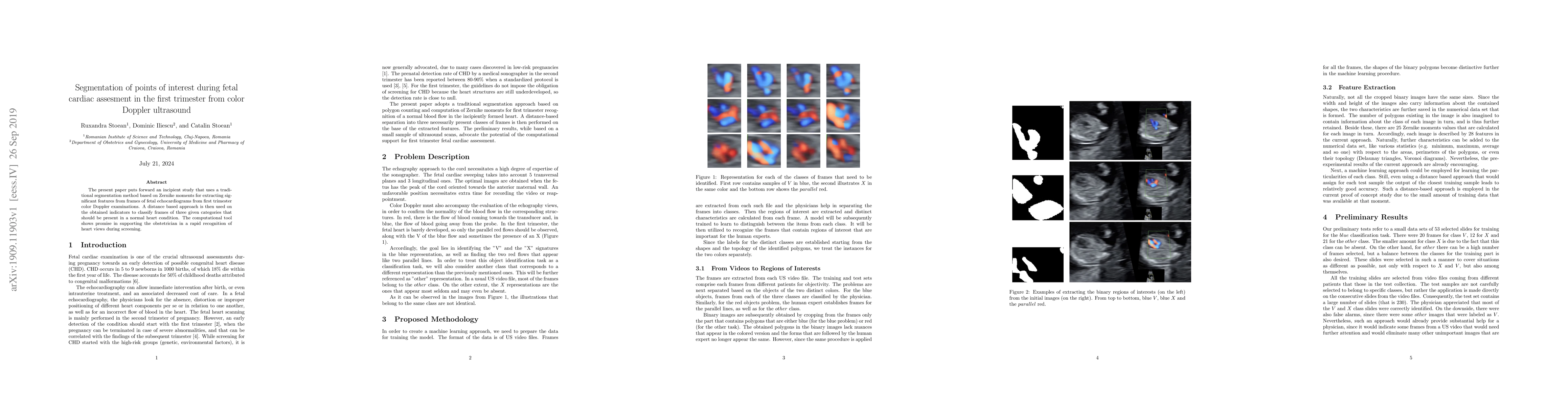 The present paper puts forward an incipient study that uses a traditional segmentation method based on Zernike moments for extracting significant features from frames of fetal echocardiograms from first trimester color Doppler examinations. A distance based approach is then used on the obtained indicators to classify frames of three given categories that should be present in a normal heart condition. The computational tool shows promise in supporting the obstetrician in a rapid recognition of heart views during screening.