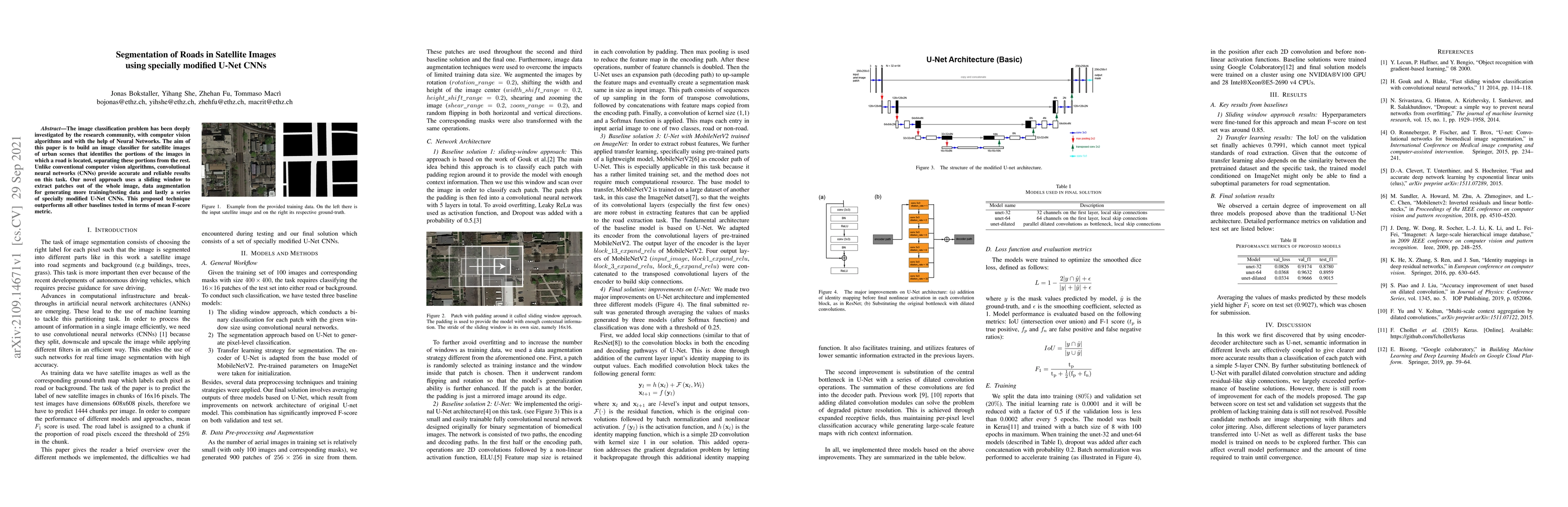 The paper proposes a novel approach for road segmentation in satellite images using specially modified U-Net CNNs. It employs a sliding window technique to extract patches, data augmentation for additional training data, and a series of modified U-Net CNNs. The approach outperforms all tested baselines in terms of mean F-score.