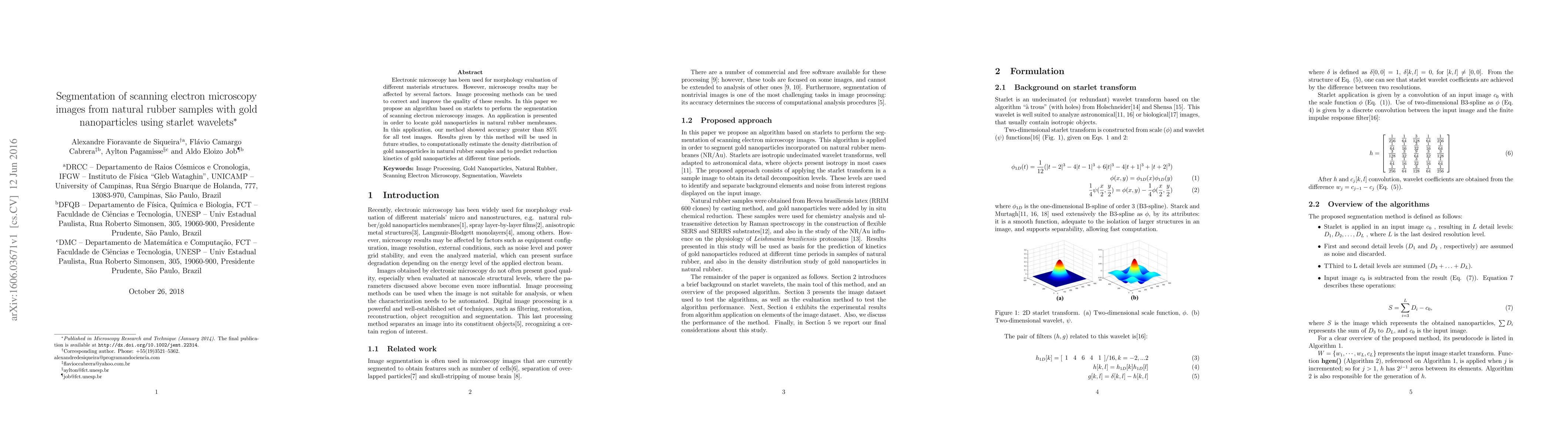 Electronic microscopy has been used for morphology evaluation of different materials structures. However, microscopy results may be affected by several factors. Image processing methods can be used to correct and improve the quality of these results. In this paper we propose an algorithm based on starlets to perform the segmentation of scanning electron microscopy images. An application is presented in order to locate gold nanoparticles in natural rubber membranes. In this application, our method showed accuracy greater than 85% for all test images. Results given by this method will be used in future studies, to computationally estimate the density distribution of gold nanoparticles in natural rubber samples and to predict reduction kinetics of gold nanoparticles at different time periods.