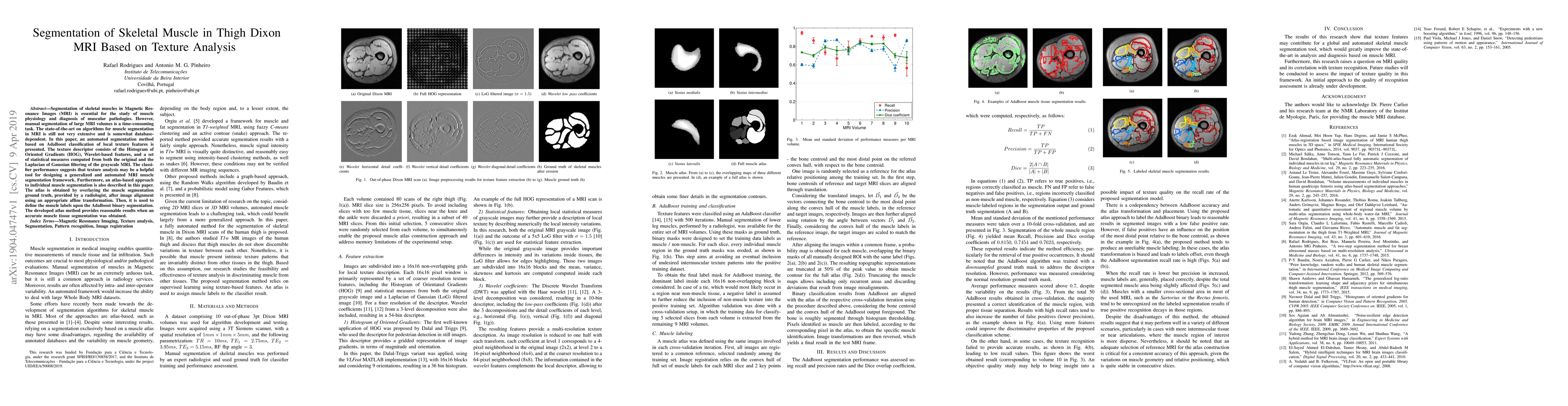 This paper presents an automated segmentation method for skeletal muscle in thigh MRI using AdaBoost classification of texture features, including HOG and wavelet-based features, to address the limitations of manual segmentation. An atlas-based approach is also introduced, leveraging radiologist-provided ground truth for improved segmentation accuracy.