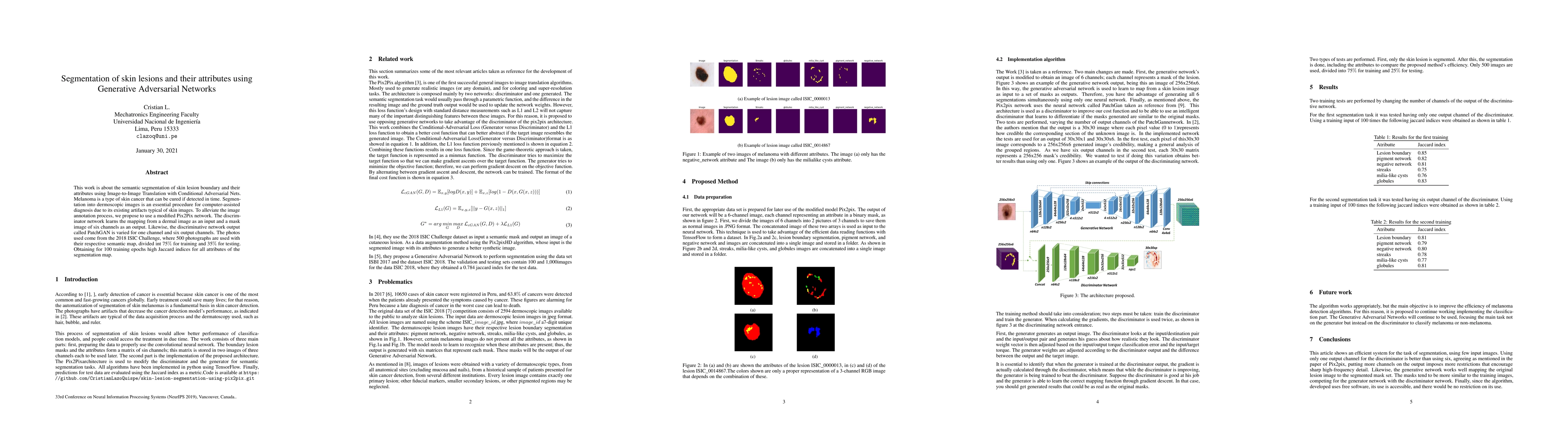This paper proposes a modified Pix2Pix network for semantic segmentation of skin lesions in dermoscopic images, aiming to assist in early melanoma detection. The model uses a PatchGAN discriminator to map input images to a six-channel mask, achieving high Jaccard indices for segmentation attributes after 100 training epochs.