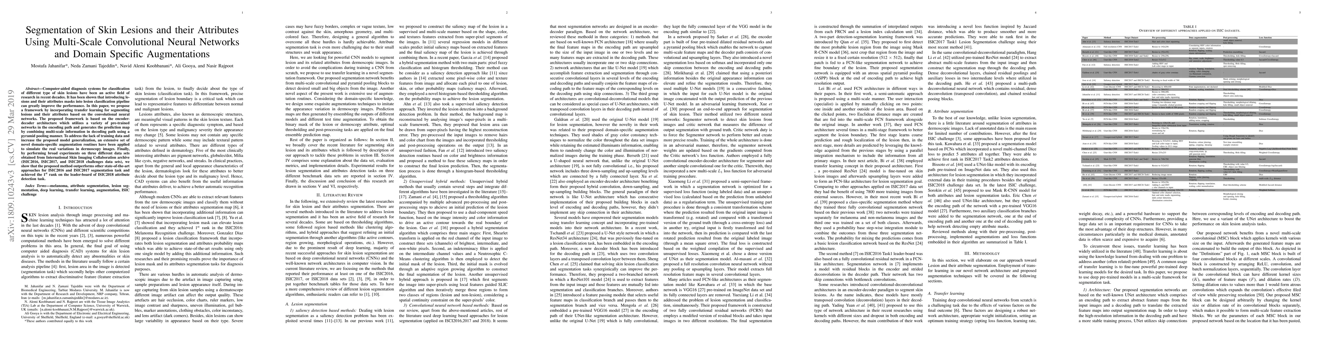 This paper proposes a framework using multi-scale convolutional neural networks and domain-specific augmentations to segment skin lesions and their attributes, achieving superior performance in skin lesion classification tasks compared to state-of-the-art methods. The method employs transfer learning and an encoder-decoder architecture with pyramid pooling for multi-scale information integration.