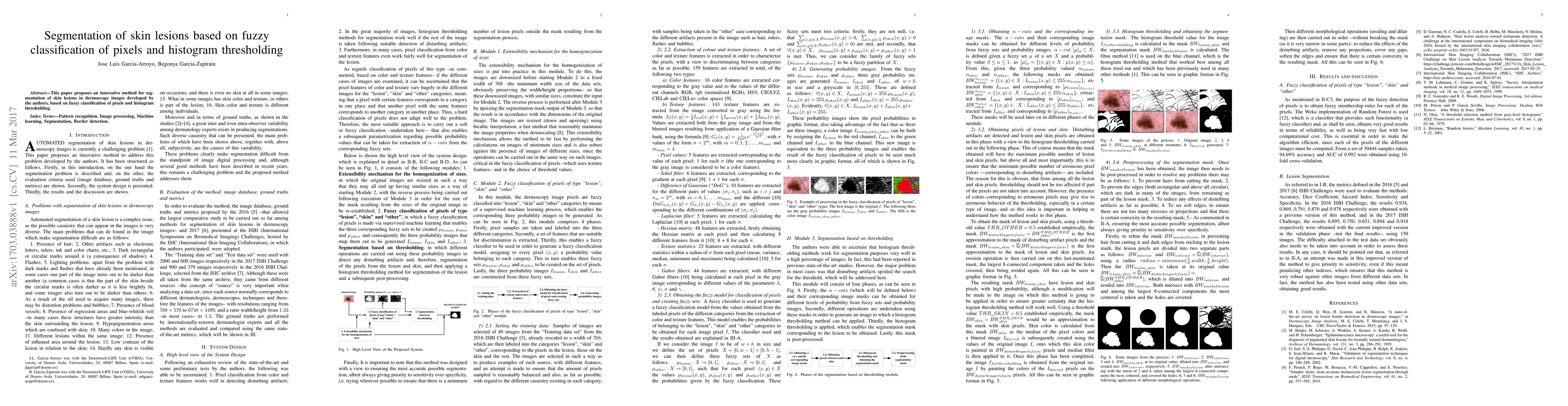 This paper proposes a skin lesion segmentation method using fuzzy classification of pixels and histogram thresholding. It involves three modules: an extensibility mechanism for homogenizing image sizes, fuzzy classification of pixels into 'lesion', 'skin', and 'other' categories, and segmentation based on thresholding with post-processing.