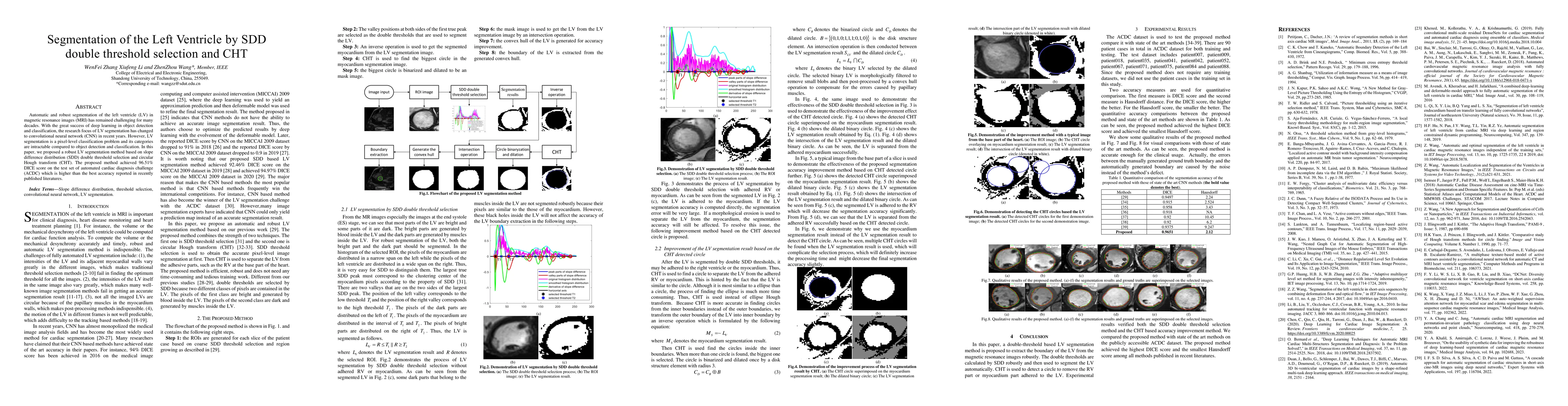 This research paper proposes a robust method for segmenting the left ventricle in MRI using slope difference distribution (SDD) double threshold selection and circular Hough transform (CHT). The method achieved a high DICE score of 96.51% on the ACDC test set, demonstrating superior performance compared to recent literature. For more details, refer directly to the original publication.