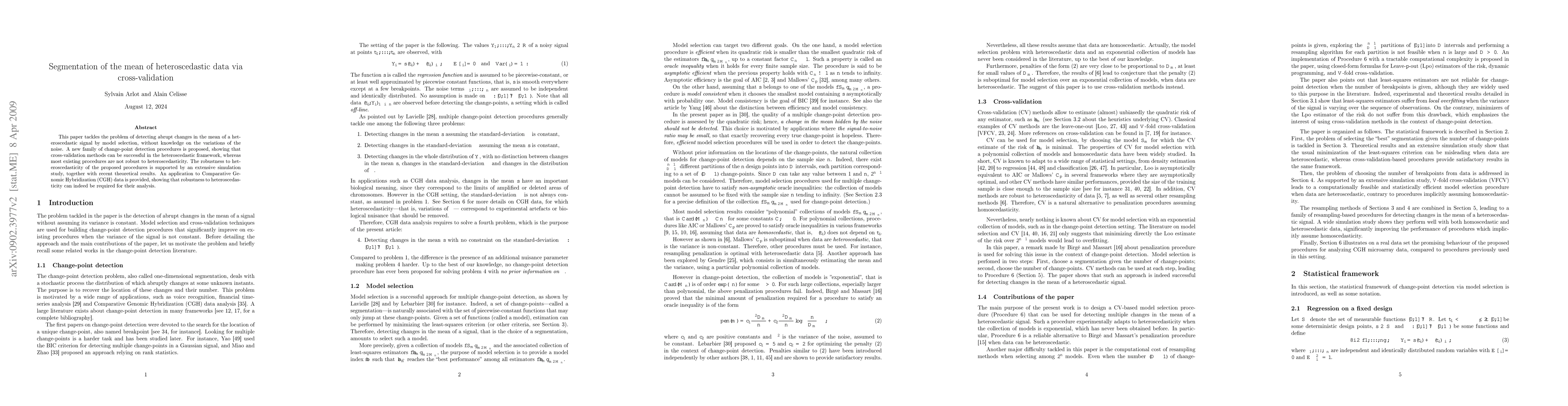 This paper tackles the problem of detecting abrupt changes in the mean of a heteroscedastic signal by model selection, without knowledge on the variations of the noise. A new family of change-point detection procedures is proposed, showing that cross-validation methods can be successful in the heteroscedastic framework, whereas most existing procedures are not robust to heteroscedasticity. The robustness to heteroscedasticity of the proposed procedures is supported by an extensive simulation study, together with recent theoretical results. An application to Comparative Genomic Hybridization (CGH) data is provided, showing that robustness to heteroscedasticity can indeed be required for their analysis.