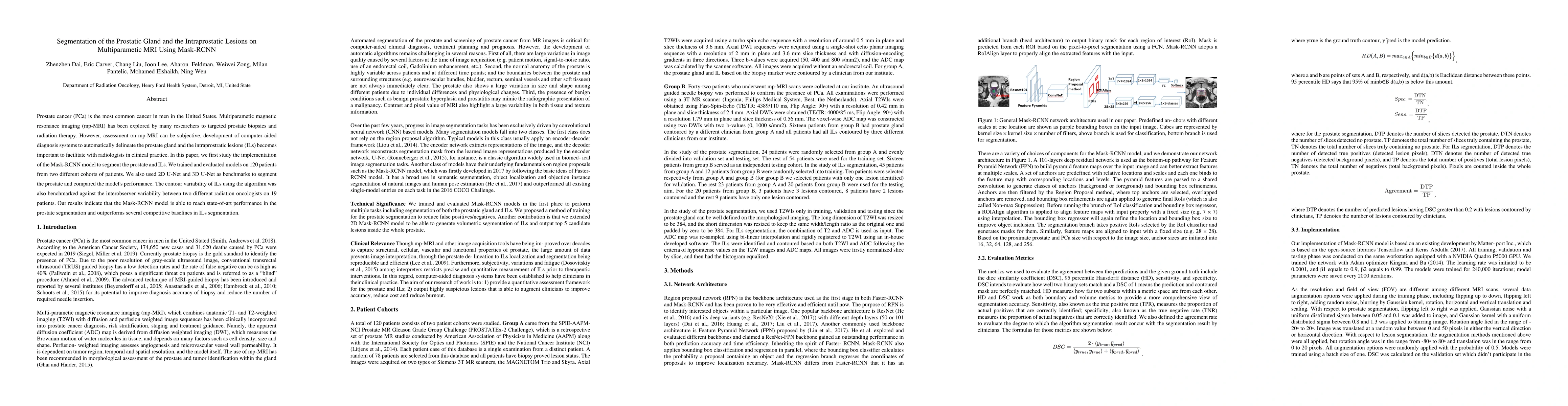 Prostate cancer (PCa) is the most common cancer in men in the United States. Multiparametic magnetic resonance imaging (mp-MRI) has been explored by many researchers to targeted prostate biopsies and radiation therapy. However, assessment on mp-MRI can be subjective, development of computer-aided diagnosis systems to automatically delineate the prostate gland and the intraprostratic lesions (ILs) becomes important to facilitate with radiologists in clinical practice. In this paper, we first study the implementation of the Mask-RCNN model to segment the prostate and ILs. We trained and evaluated models on 120 patients from two different cohorts of patients. We also used 2D U-Net and 3D U-Net as benchmarks to segment the prostate and compared the model's performance. The contour variability of ILs using the algorithm was also benchmarked against the interobserver variability between two different radiation oncologists on 19 patients. Our results indicate that the Mask-RCNN model is able to reach state-of-art performance in the prostate segmentation and outperforms several competitive baselines in ILs segmentation.
