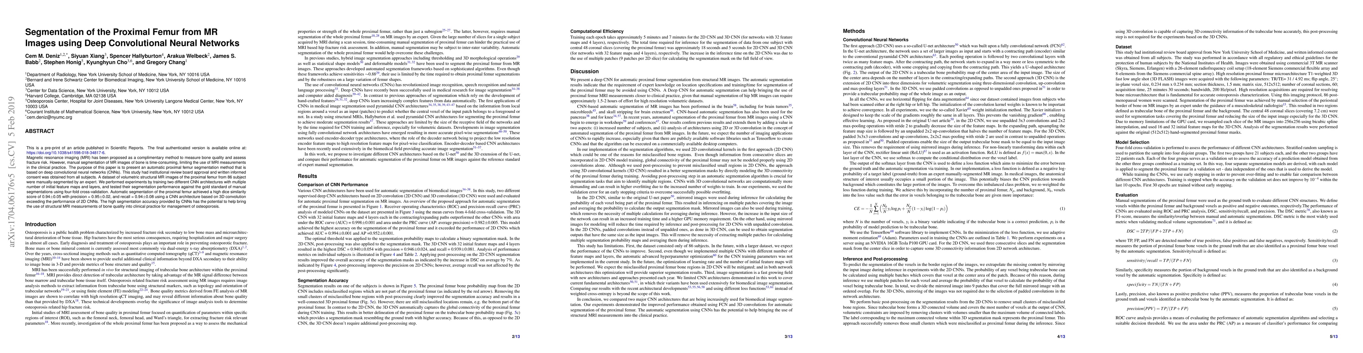 This paper presents an automatic segmentation method for proximal femur using deep convolutional neural networks (CNNs) to enhance MRI analysis for bone quality assessment. The study achieved high segmentation accuracy with a dice similarity score of 0.94±0.05, suggesting the potential to integrate MRI measurements into clinical practice for osteoporosis management.