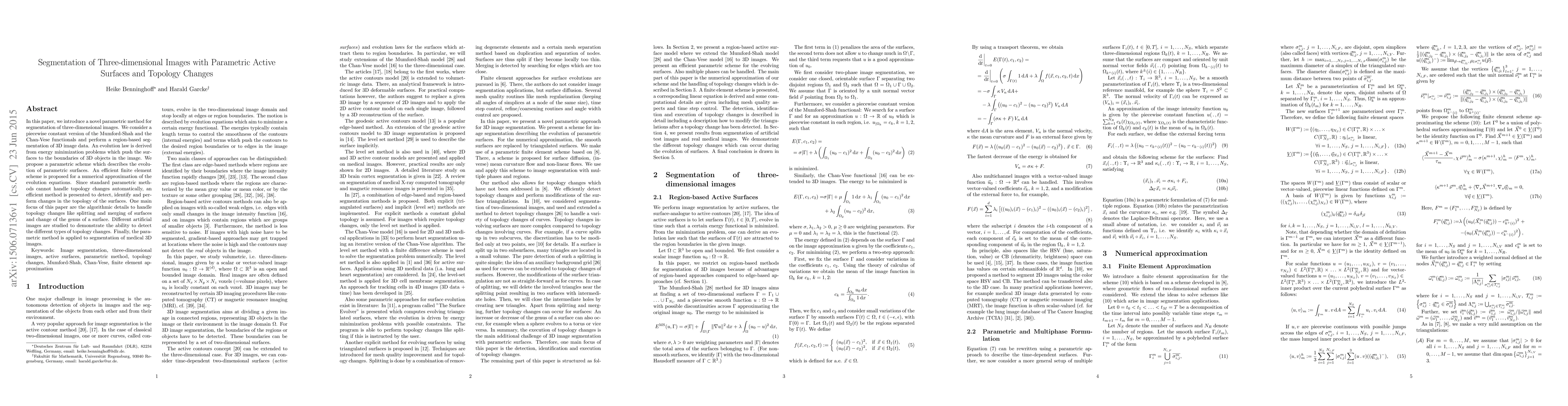 This paper presents a novel parametric method for segmenting 3D images using region-based segmentation and an evolution law derived from energy minimization. It introduces an efficient finite element scheme and a method to handle topology changes, including splitting, merging, and genus changes, demonstrated through artificial and medical 3D images.