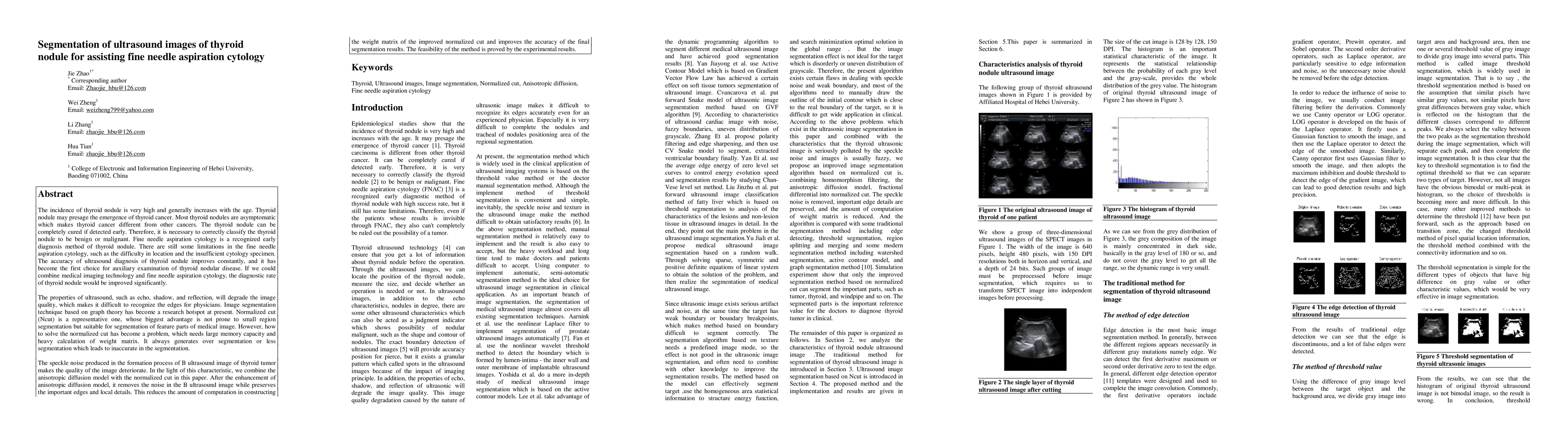 This paper proposes a method combining anisotropic diffusion and improved normalized cut for segmenting ultrasound images of thyroid nodules to assist fine needle aspiration cytology. The anisotropic diffusion model reduces noise while preserving edges, which enhances segmentation accuracy and reduces computational load compared to traditional methods.