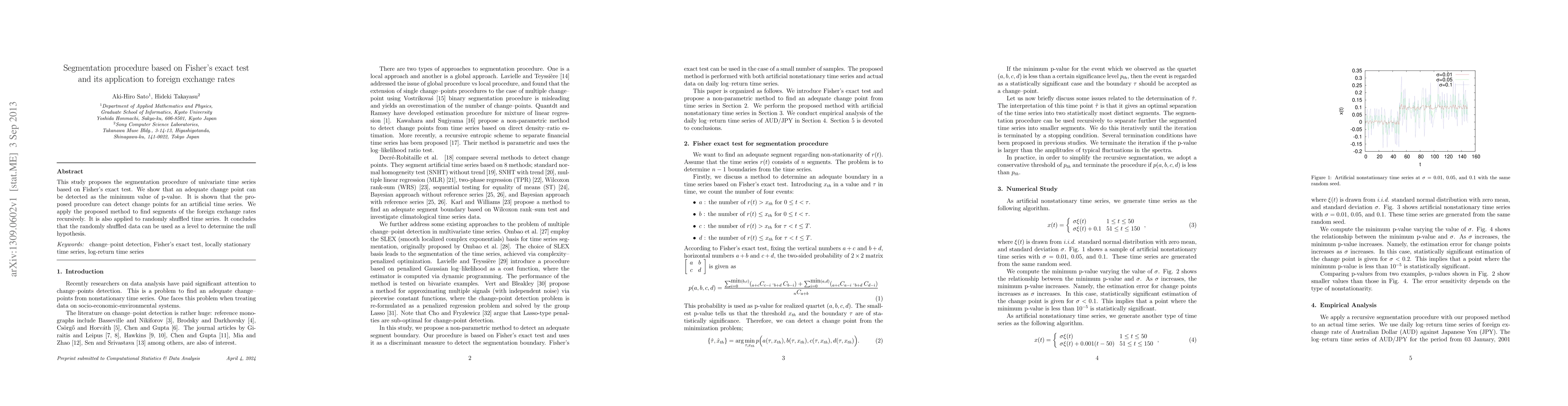 This study proposes the segmentation procedure of univariate time series based on Fisher's exact test. We show that an adequate change point can be detected as the minimum value of p-value. It is shown that the proposed procedure can detect change points for an artificial time series. We apply the proposed method to find segments of the foreign exchange rates recursively. It is also applied to randomly shuffled time series. It concludes that the randomly shuffled data can be used as a level to determine the null hypothesis.