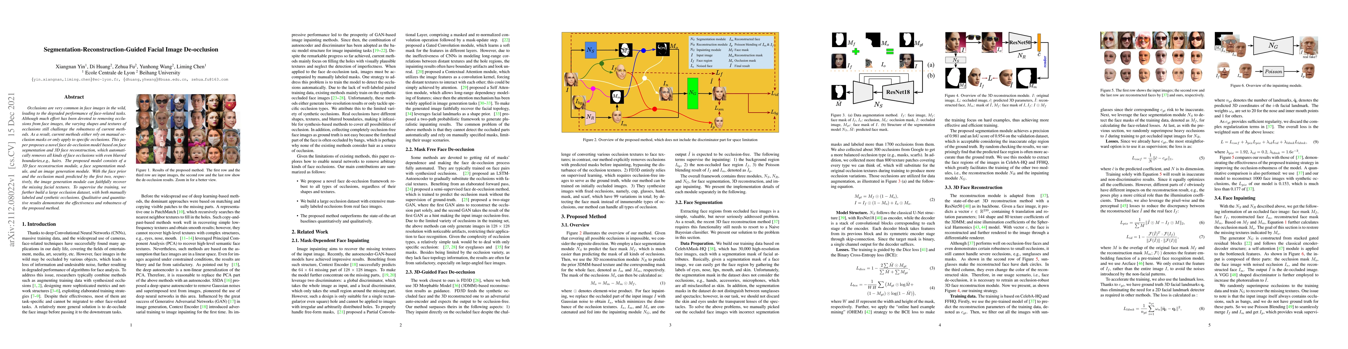 This paper introduces a novel face de-occlusion model that leverages face segmentation and 3D reconstruction to automatically remove various occlusions, including those with blurred boundaries like hair. The model comprises a 3D reconstruction, segmentation, and image generation module, which together reconstruct occluded facial textures effectively.