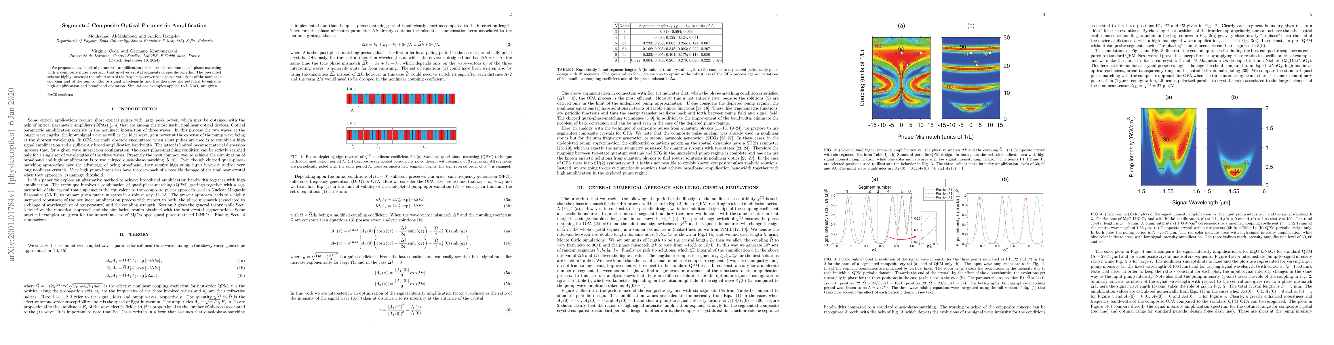 This paper introduces a segmented composite optical parametric amplification method that leverages quasi-phase-matching and composite pulse techniques to significantly boost robustness against wavelength variations and nonlinear coupling fluctuations, potentially enabling high amplification and broadband operation. Simulation results for LiNbO_3 demonstrate its effectiveness.