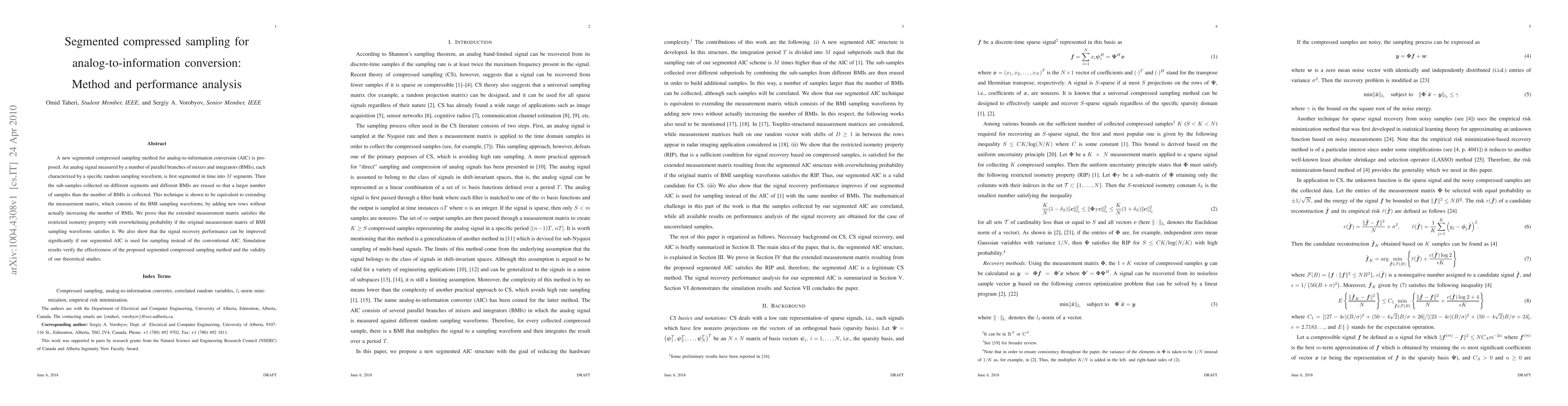 A new segmented compressed sampling method is proposed for analog-to-information conversion, showing improved signal recovery performance compared to traditional methods.
